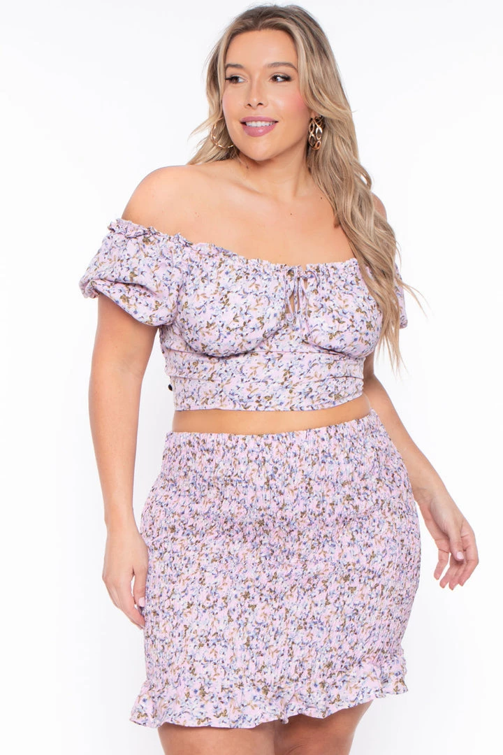 This plus size, matching skirt set features frilly puff sleeves and frilly hem on skirt. Adjustable front tie along neckline, great stretch to hug your curves and primrose floral design all over perfect for spring