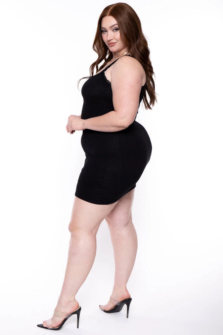 This plus size, rib knit bodycon cami dress features a curve hugging silhouette, low scoop neckline and lace trim detail