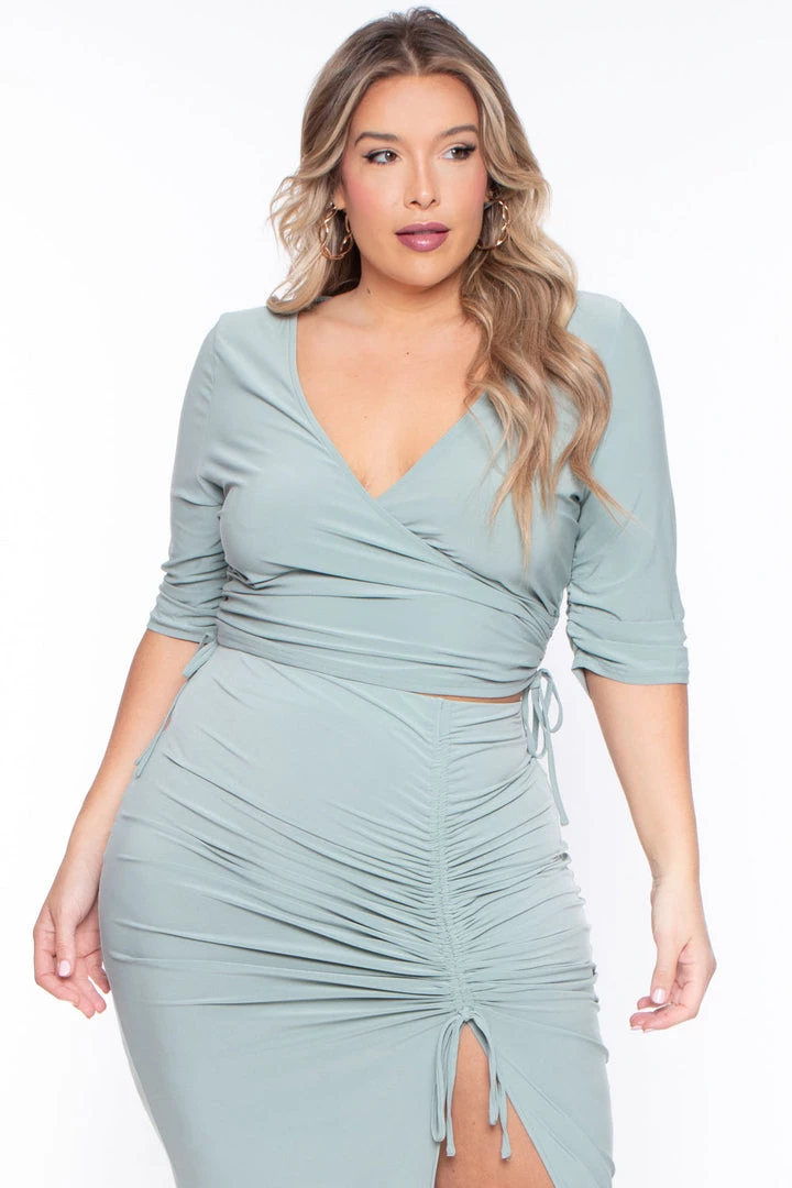 This plus size, matching set features ruched sleeves and deep v neckline. The skirt has an adjustable ruching detail for a high or low slit
