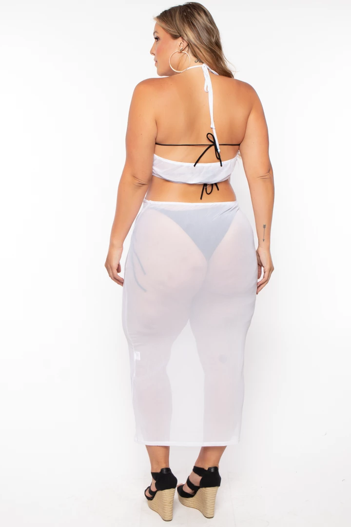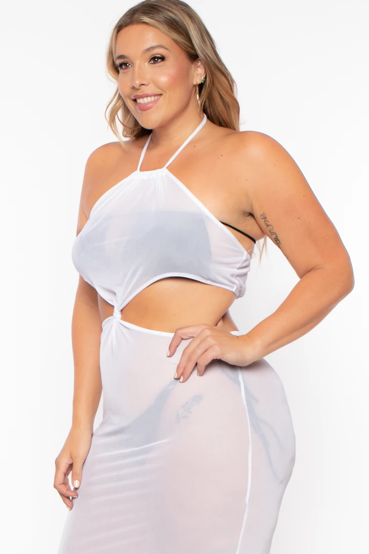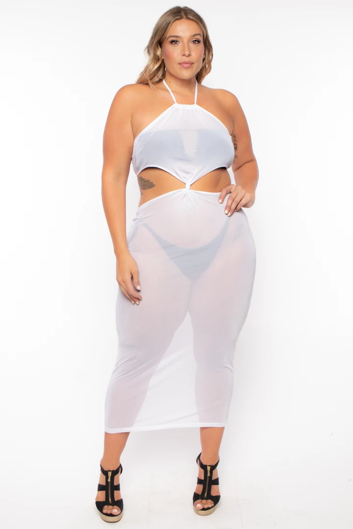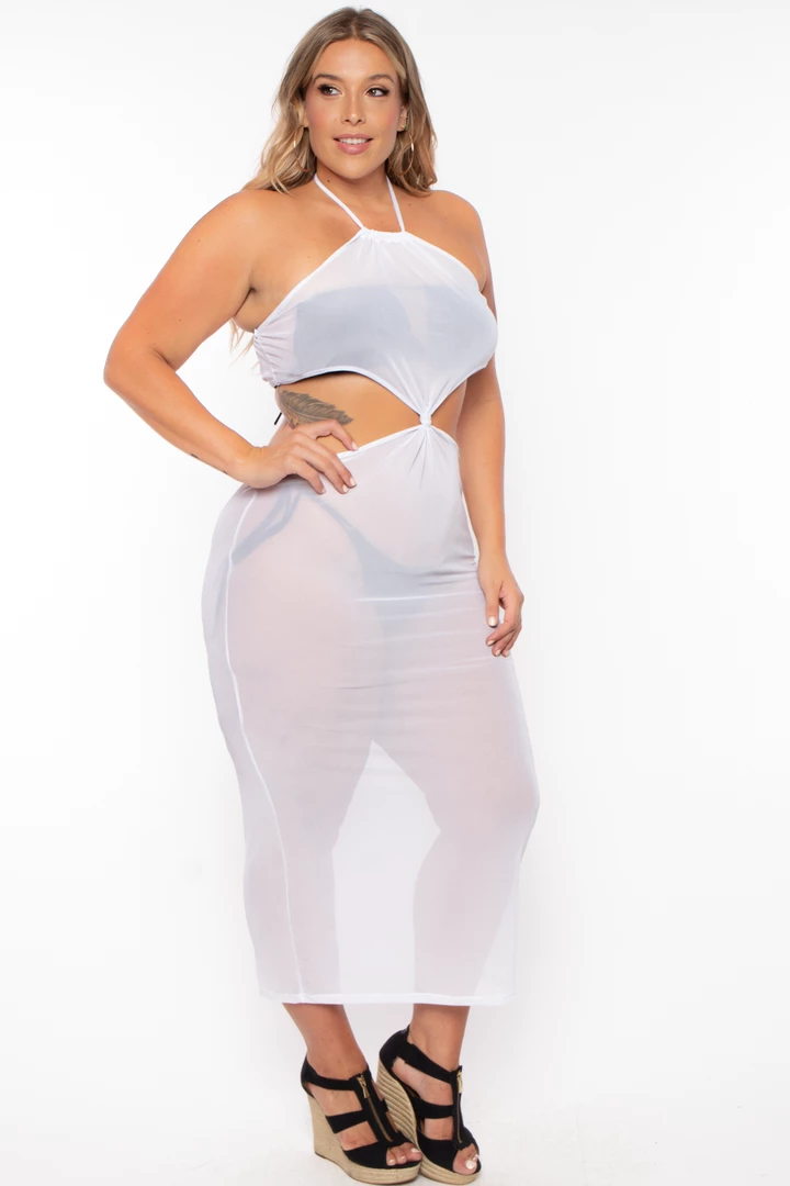 This plus size, stretch knit mesh dress futures halter neckline spaghetti straps tie cut out design from sides front and back, knot front twist, and a midi dress length