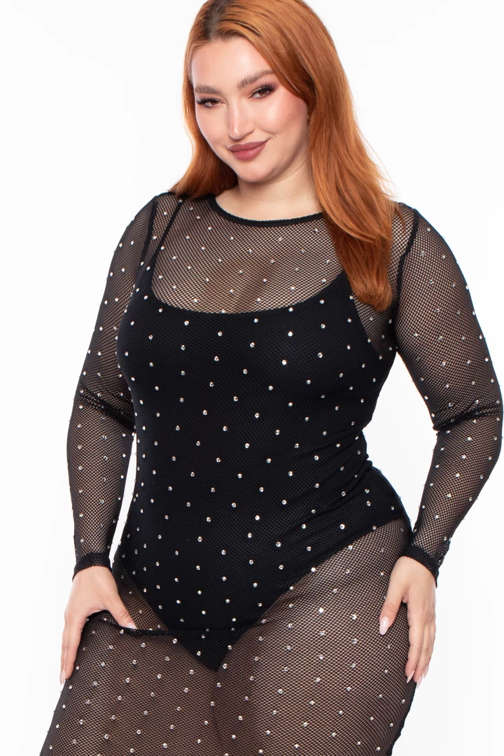 This plus size stretch dress features an all over mesh material with rhinestone detail, crew neckline, long sleeves, bodycon, and a midi length silhouette. Bodysuit not included.