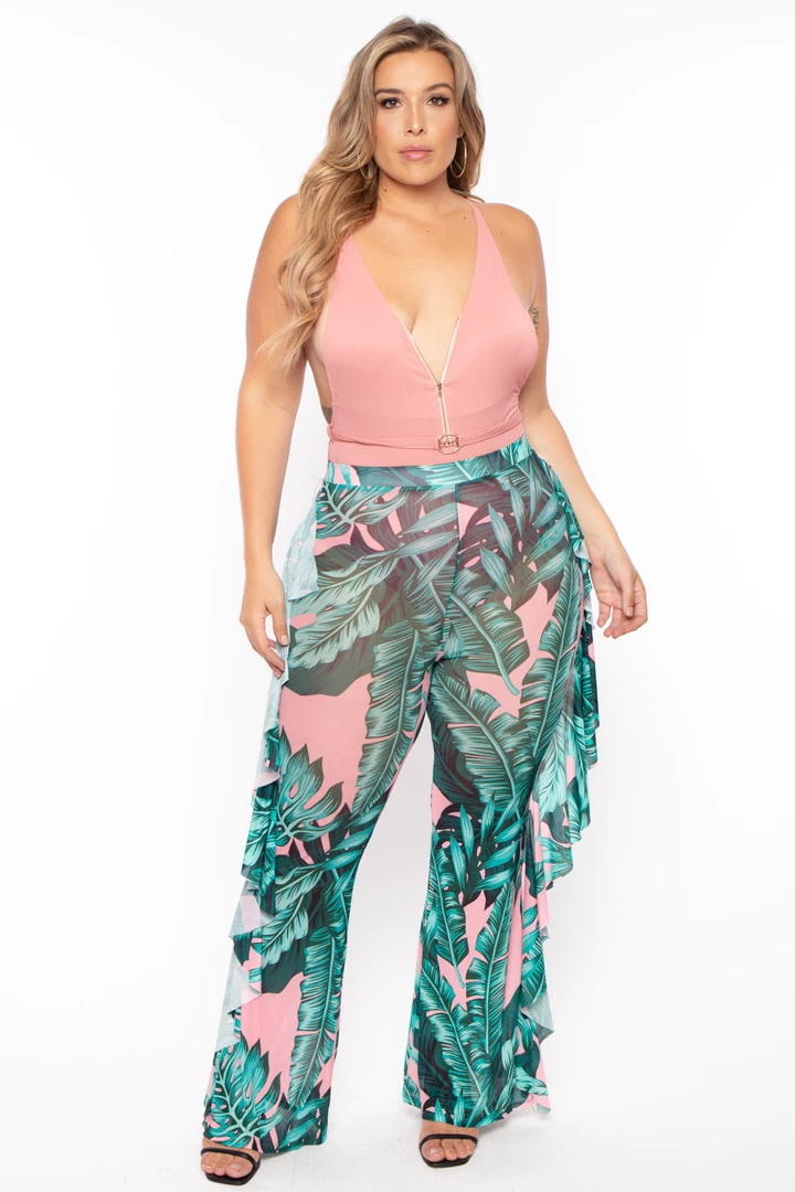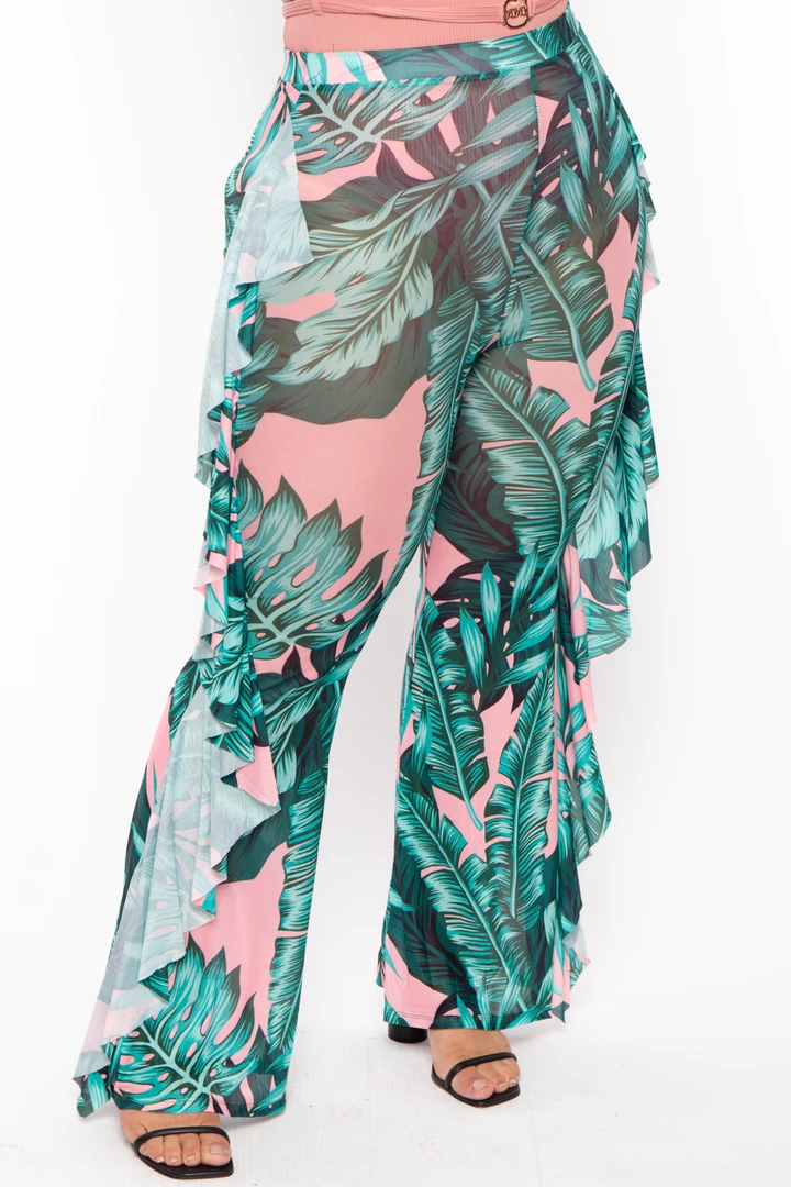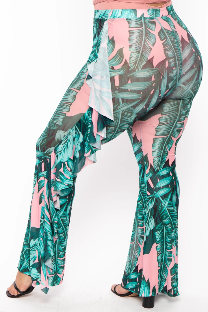 This plus size, stretch tropical print mesh ruffle pant features an elastic waist, form-fitting silhouette & flared hem. This is a perfect look from poolside to dinner.