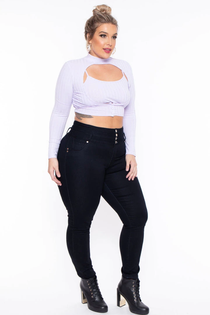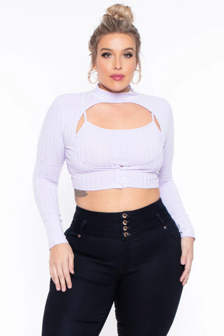 This plus size stretch knit set features a cami top with scoop neckline, sleeveless, adjustable cami straps, and a cropped hem. Paired with a chic cropped topper to elevate the look that features a mock neckline with zipper detail on shoulder, hole in the bust area, long fitted sleeves, 3 button closure, and a cropped hem.