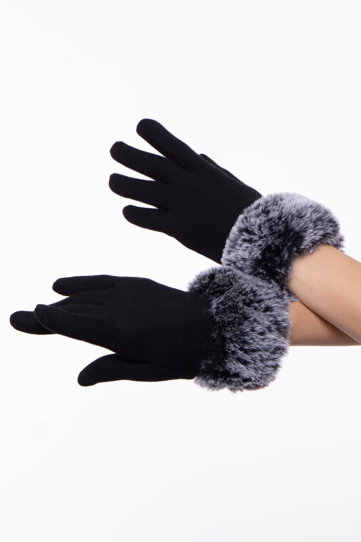 Keep your hands tucked away from the cold and still so glam and Haute with our Gloves! These glam gloves have fitted faux fur cuffs and a slightly fuzzy knit contrast black inner construction.