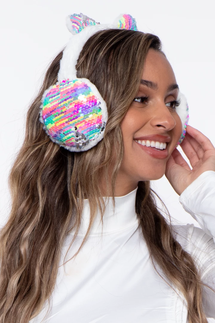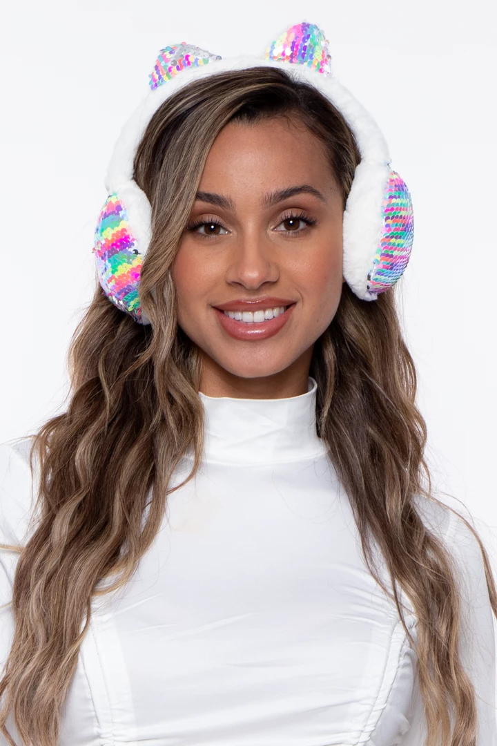 Chilly days are coming, and our iridescent sequins and white Fur Ear Muffs have got your covered with adorable Kitty ears ! Soft faux fur covers adds a luxe touch to these plush ear muffs. Perfect to keep you ear nice and warm.