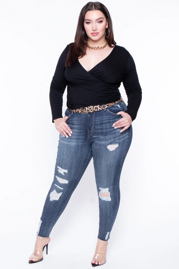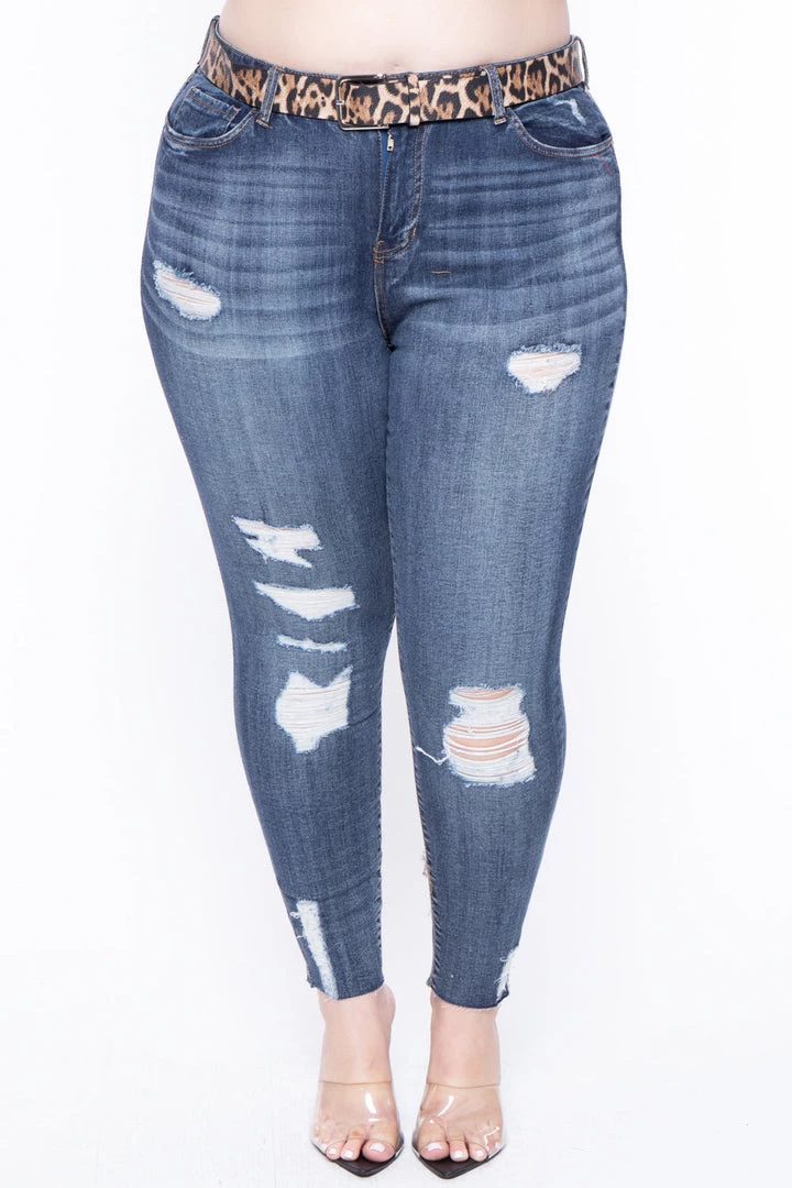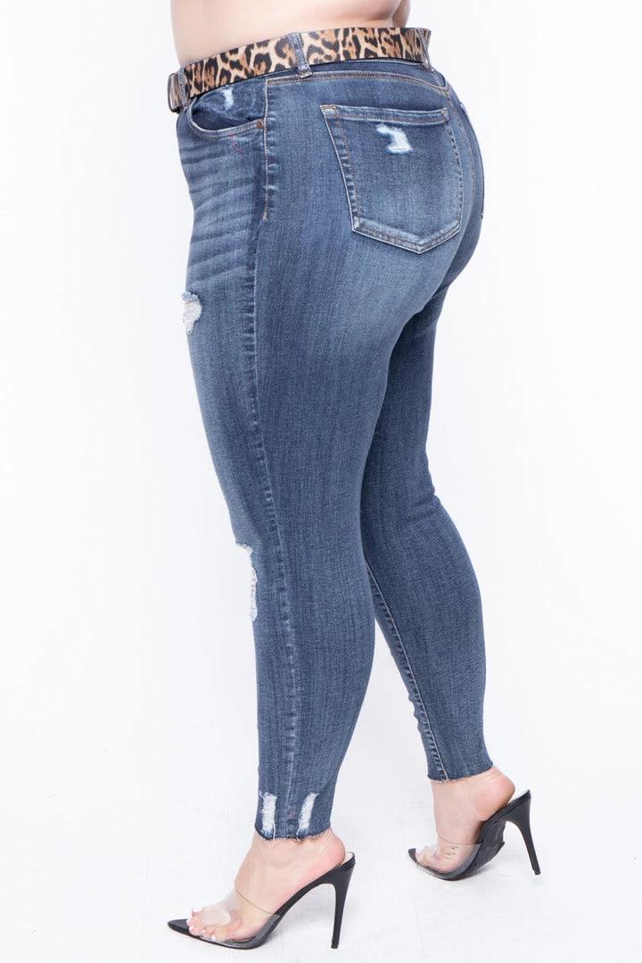This plus size, dollhouse jean features a zipper fly with button closure, 5-pocket construction, a distressed design, and a removable leopard belt, and a skinny leg with a raw edge fray hem.