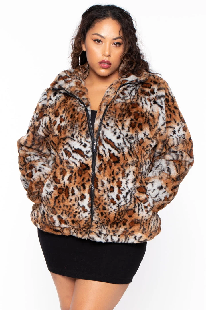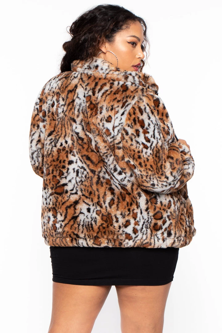 This plus size, plush faux fur coat features an all around tiger print notched collar, long sleeves, on-seam pockets, fully lined, and a zipper front closure.