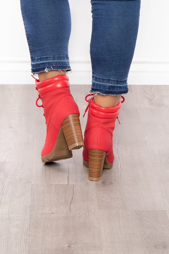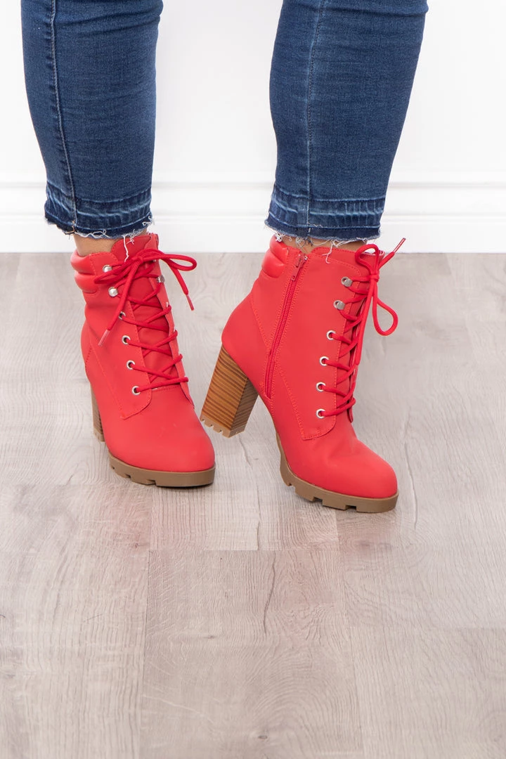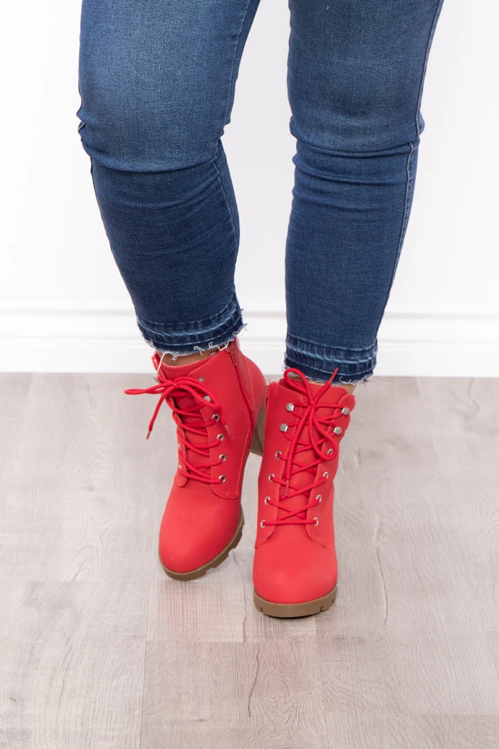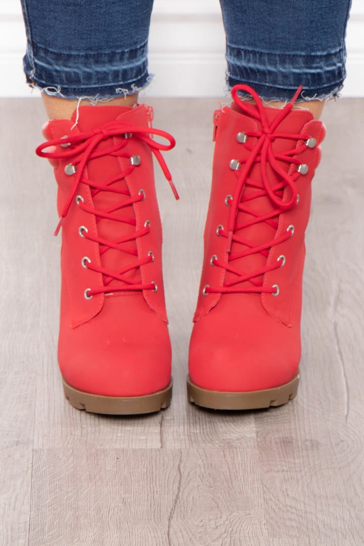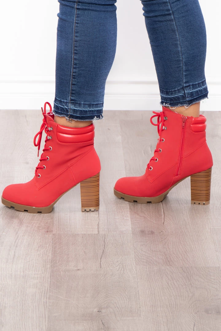A pair of faux nubuck boots, by Bamboo Shoes, featuring an almond toe, lace-up closure, cushioned ankle wrap, an inner ankle zipper closure, and a contrasting 4″ block heel.