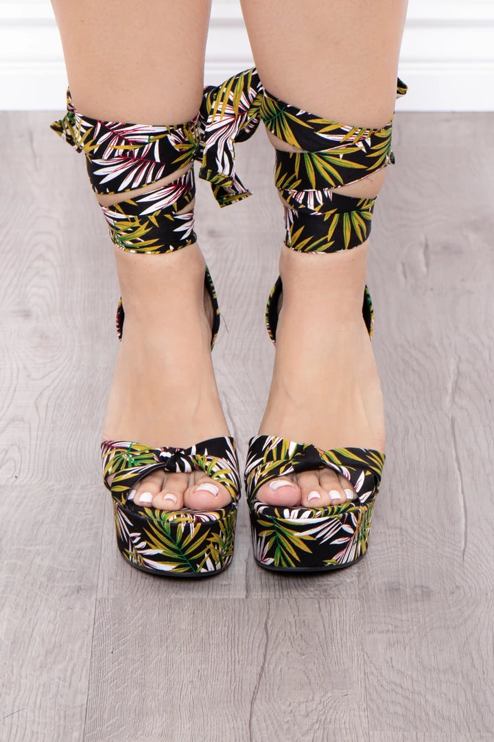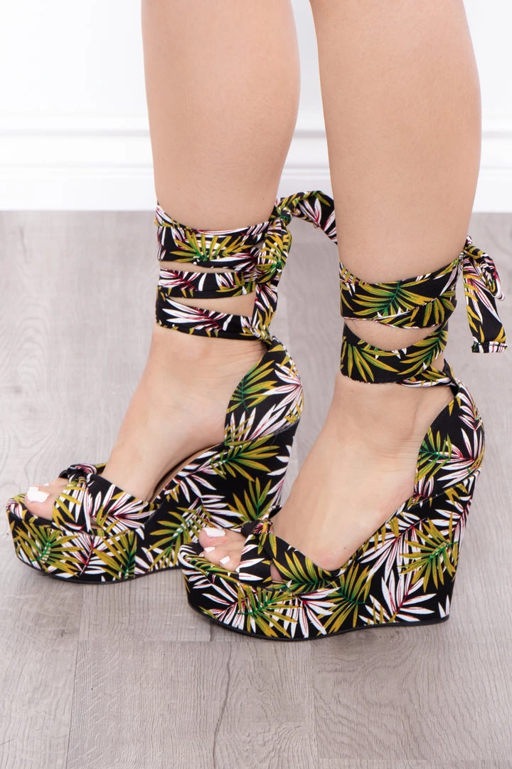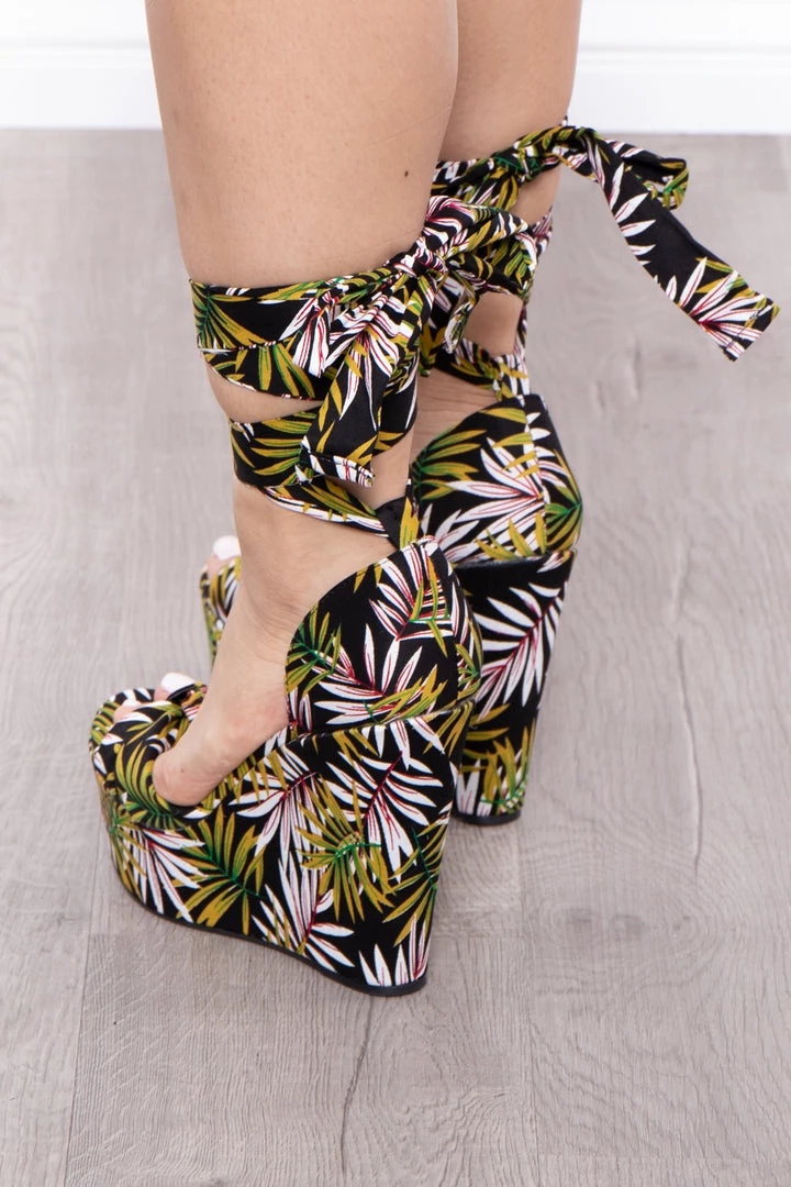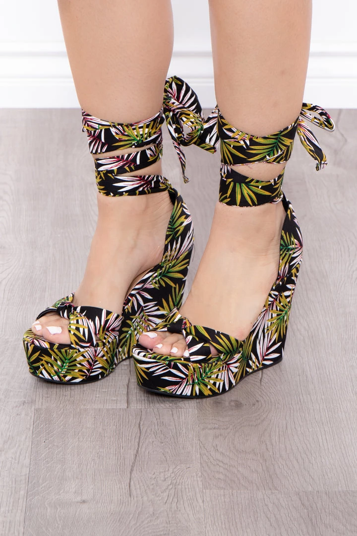 A pair of all-over tropical printed wedges, by Bamboo Shoes, featuring an open toe design, with a dual twist strap over the toes, and a lace-up ankle strap, with a covered heel.