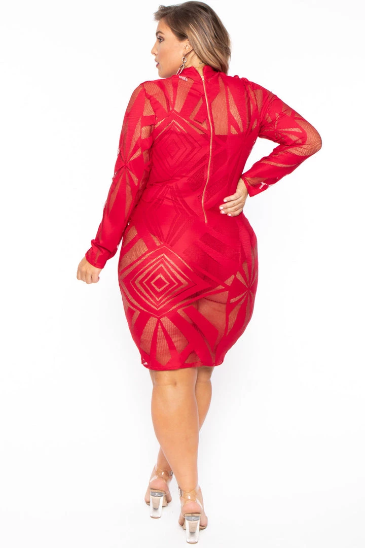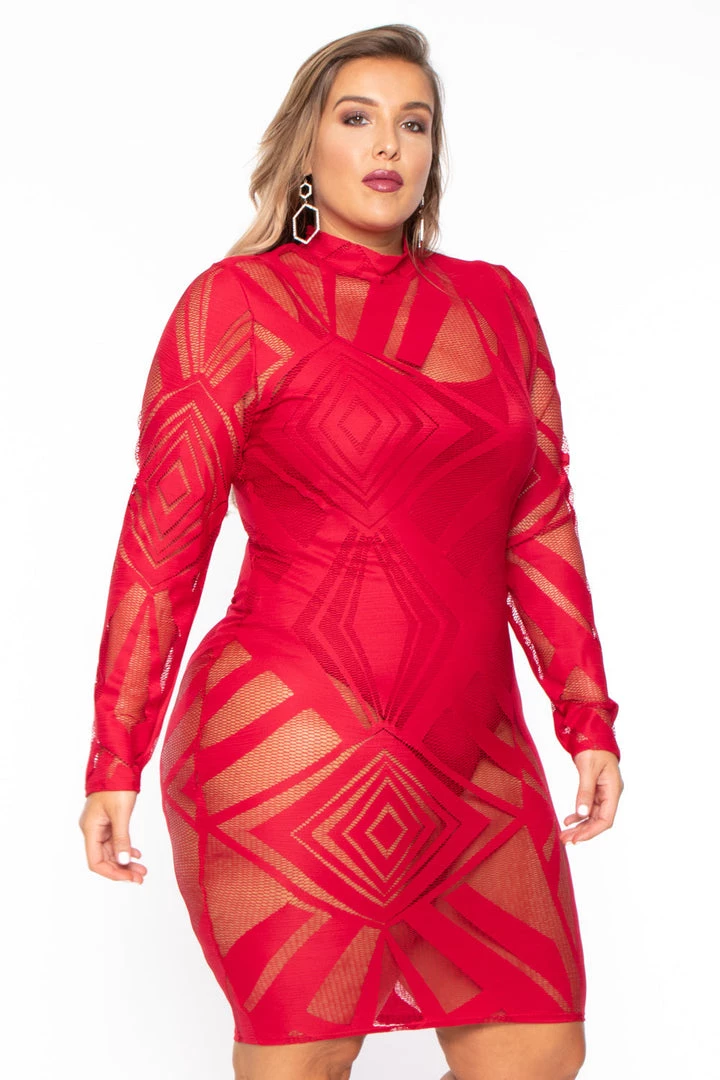 This plus size, stretch knit dress features a crew neckline, long sleeves, mesh fabric with a burn-out architectural effect, slight sheer, a back zipper, and a bodycon silhouette.Â