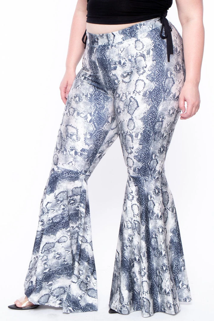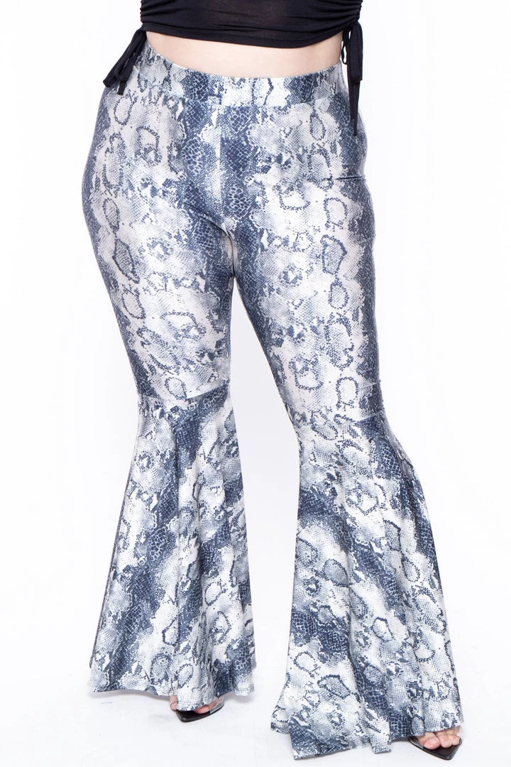 This plus size, stretch snake print pants feature, an elastic waist for an added comfort, and a flare leg
