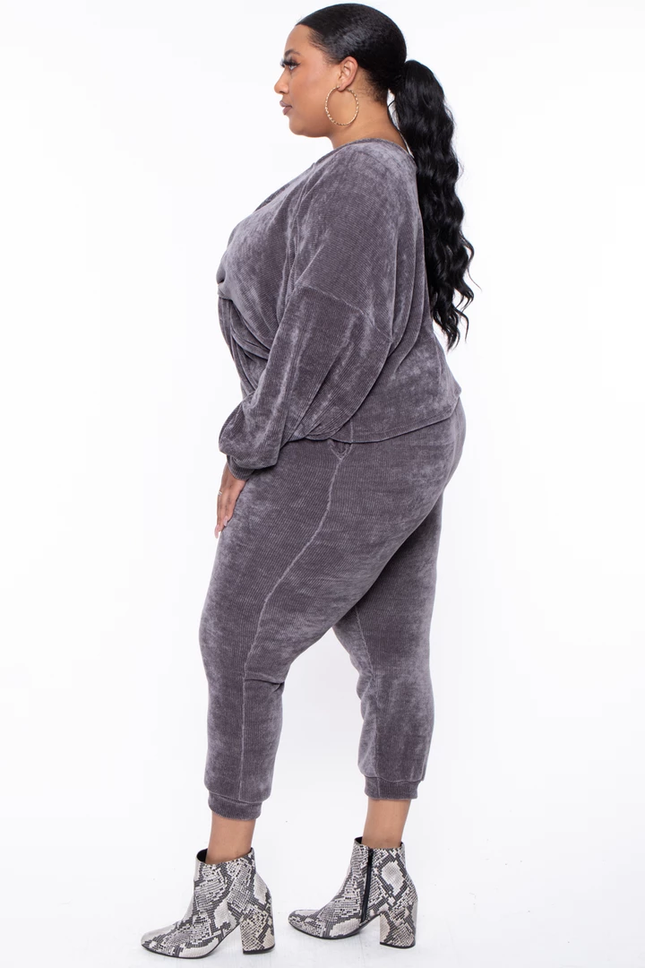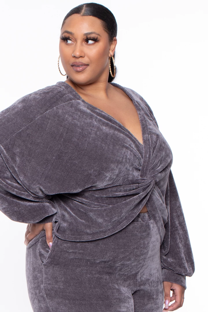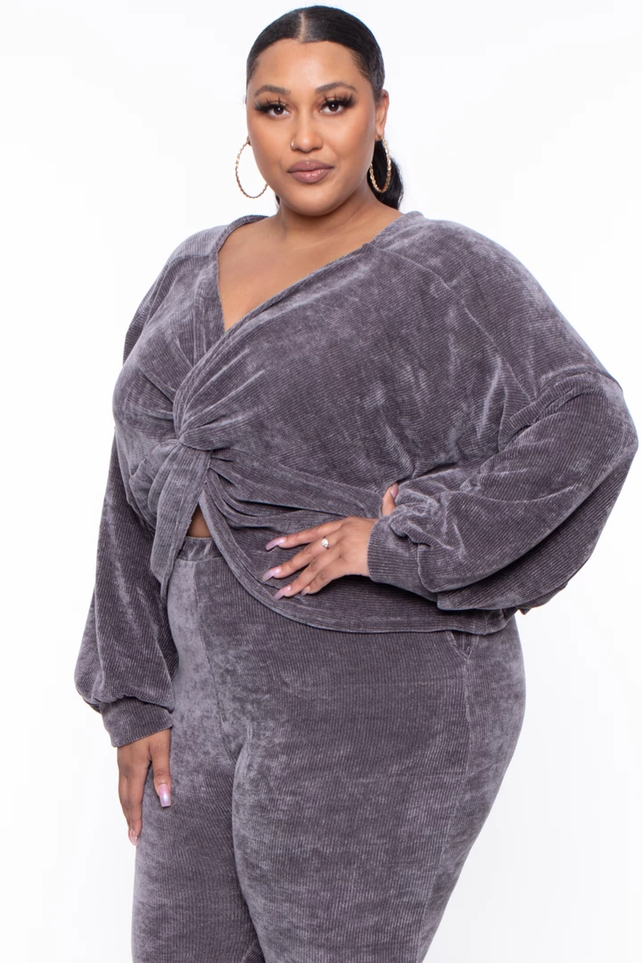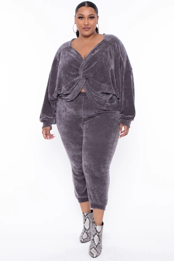 This plus size set futures a V-neckline top with front twist detail making the top a crop, long sleeves with self cuff, the pants have elastic waist relax fir and self hem with very comfy chenille texture Â