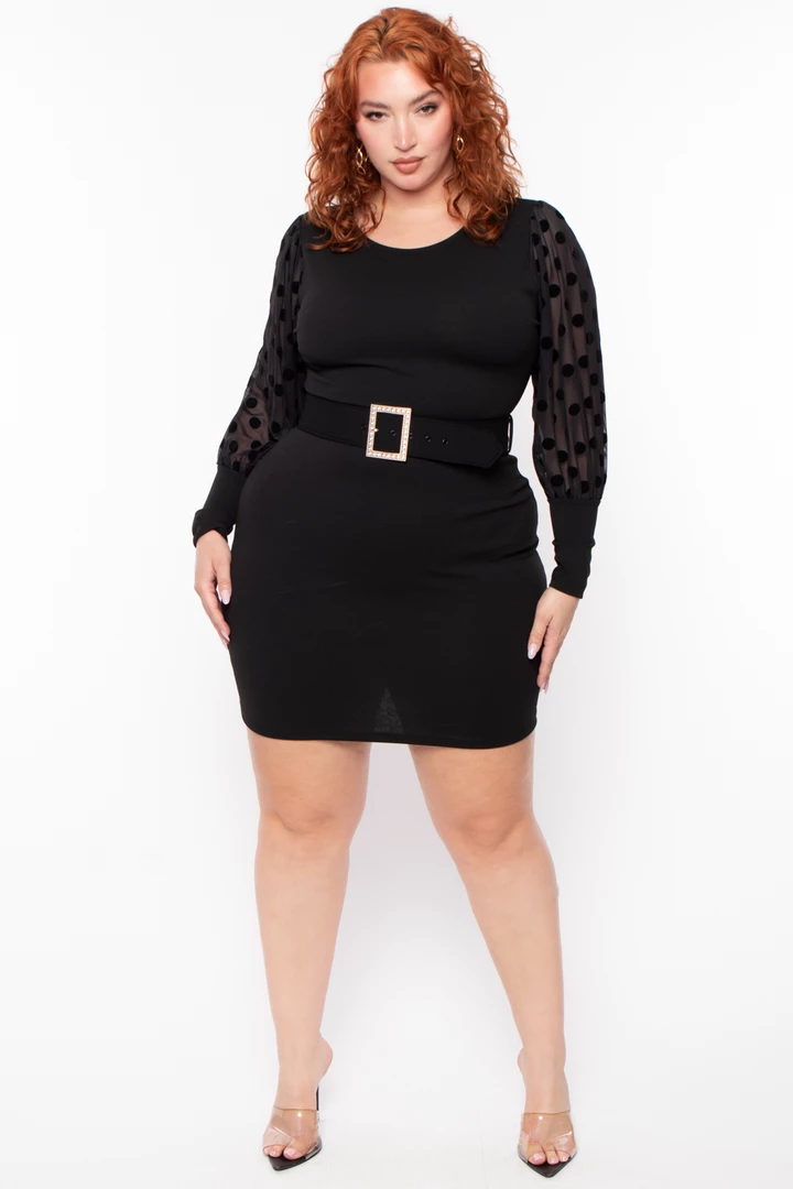 This plus size, stretch knit dress features a round neckline, velvet flock mesh sleeves, stand-alone belt, and body curing silhouette.
