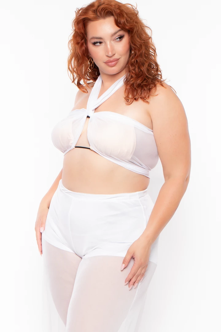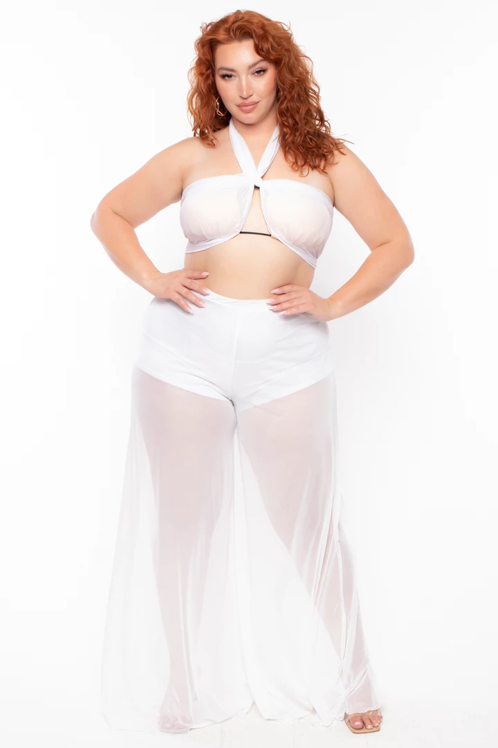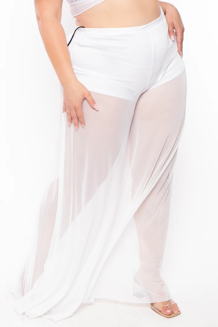 This plus size, sheer mesh stretch swim cover-up pants set features an elasticized waist shots length lining self sash, and flared hem.