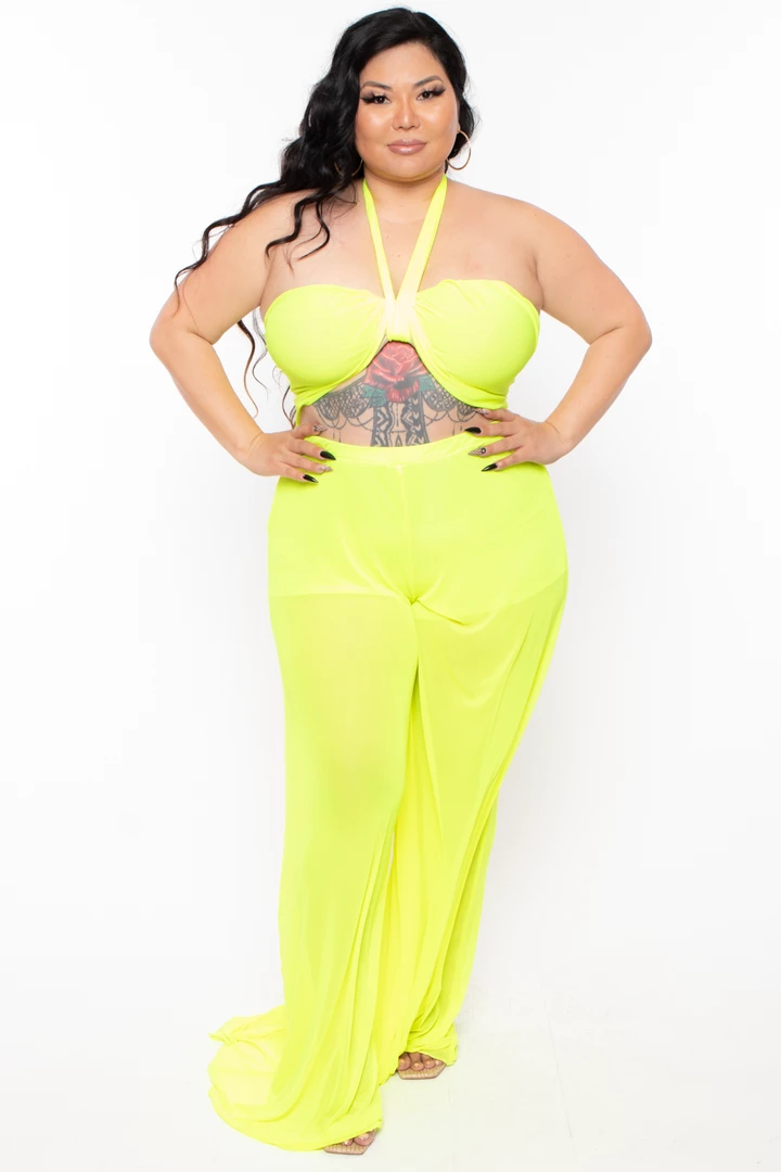 This plus size, sheer mesh stretch swim cover-up pants set features an elasticized waist shots length lining self sash, and flared hem.