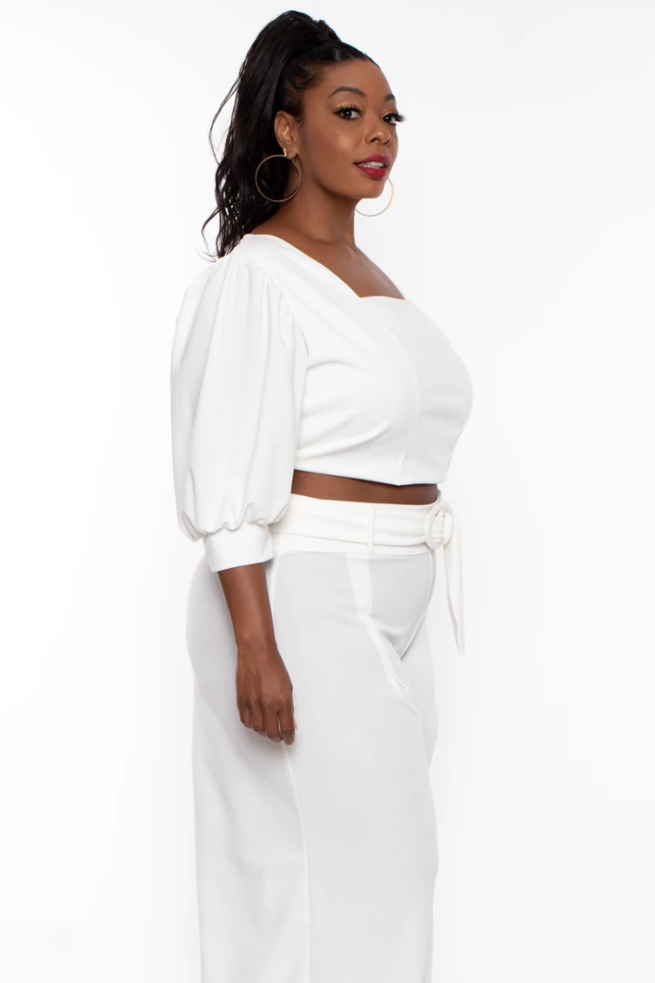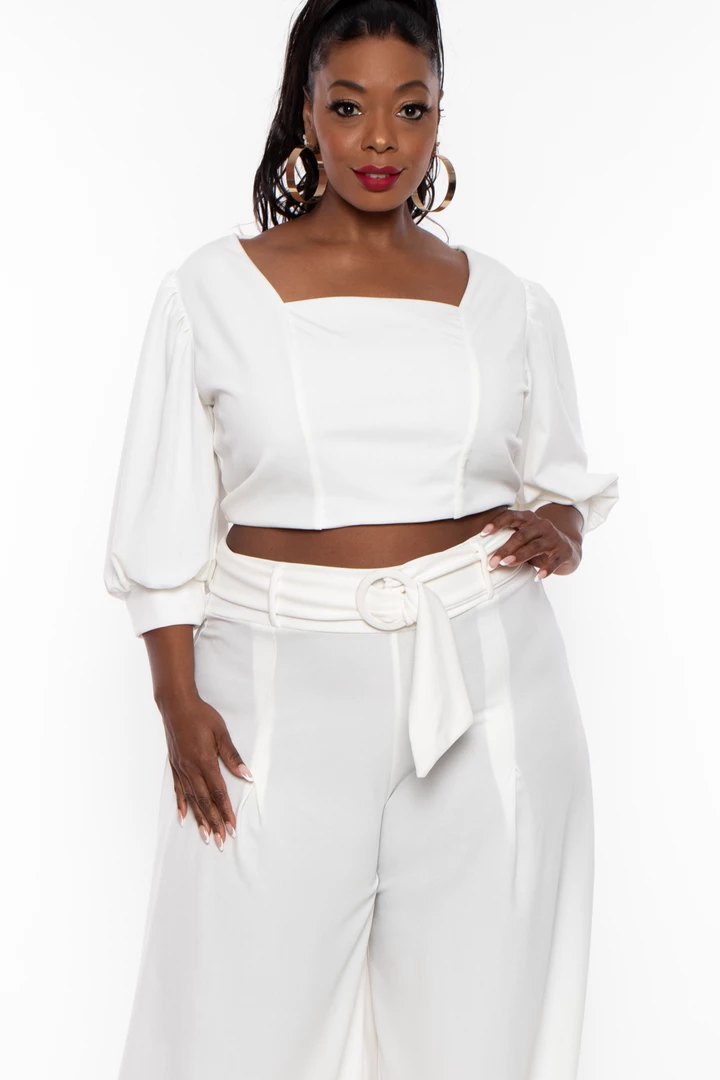 This plus size, stretch rich crepe matching set features a crop top with princess cut and a square neckline, wide 3/4 sleeves with seld band hem and gathering detail, The matching pants feature a self waistband with self-belt and belt loops and pleats wide leg style. This set is very elegant and sophisticated.