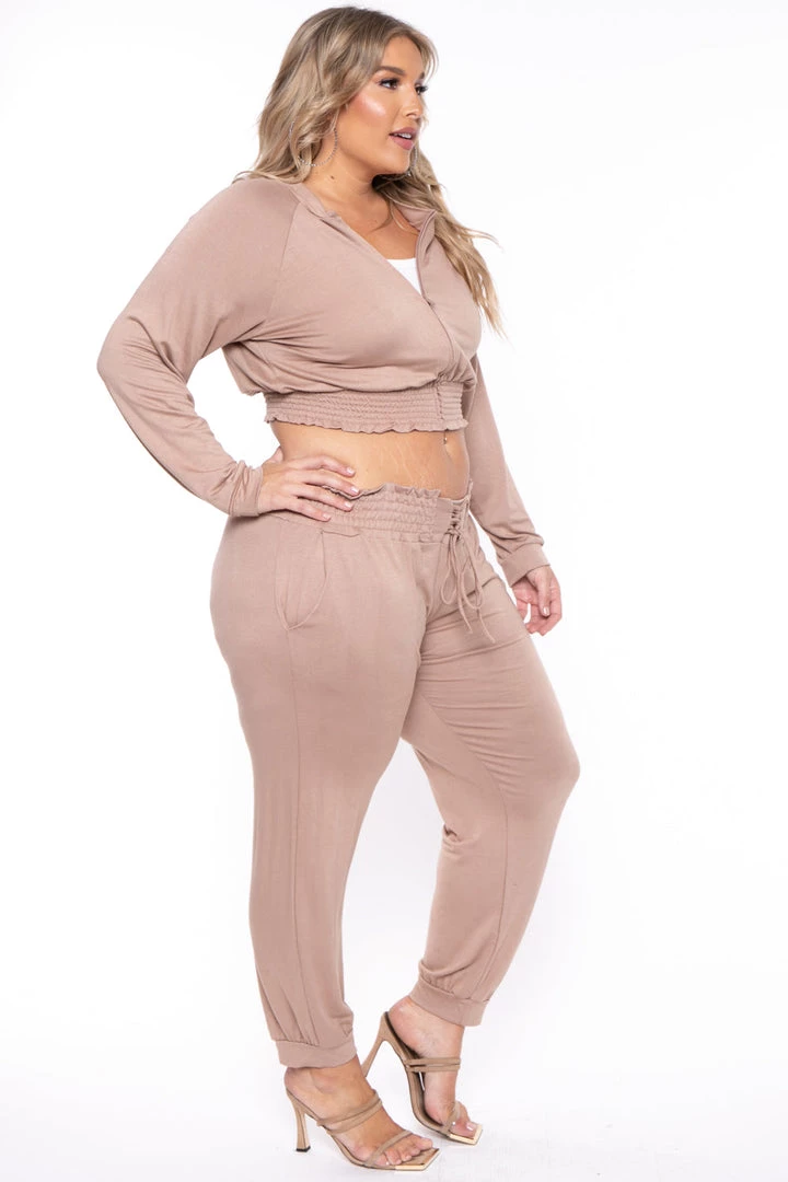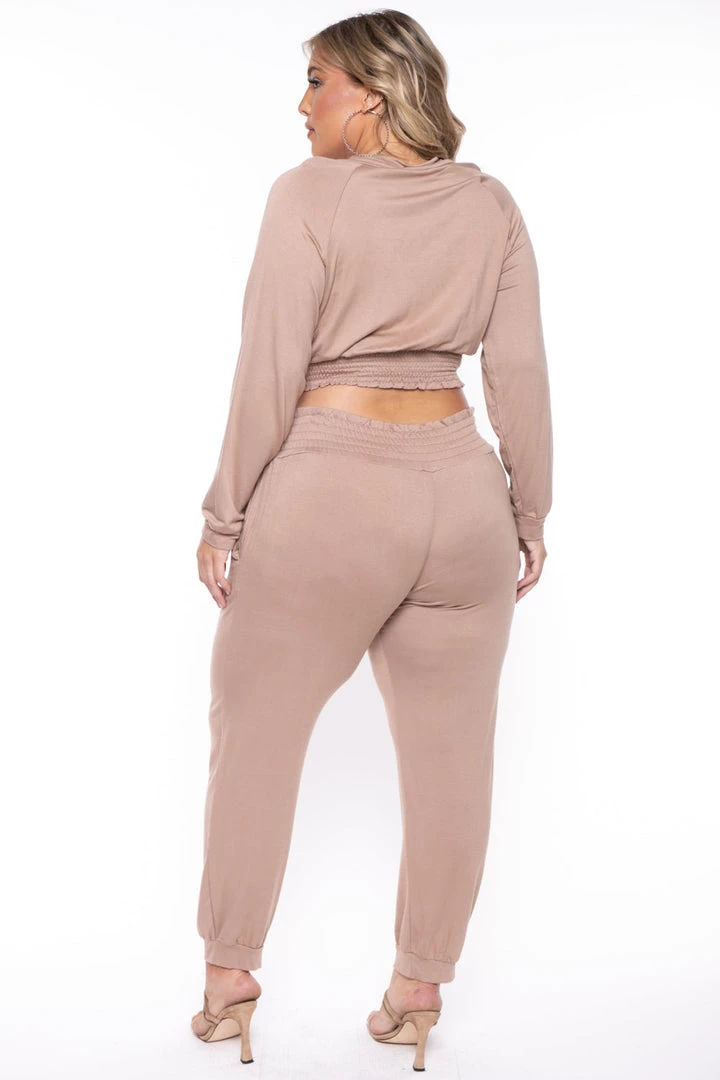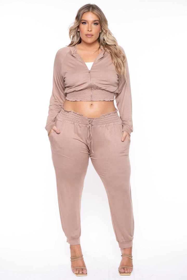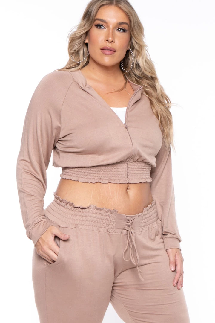 This plus size, matching jogger set features soft lightweight material, long sleeves, cropped jacket with smocking details that match the pants. The matching pants come with pockets and have an adjustable waistband