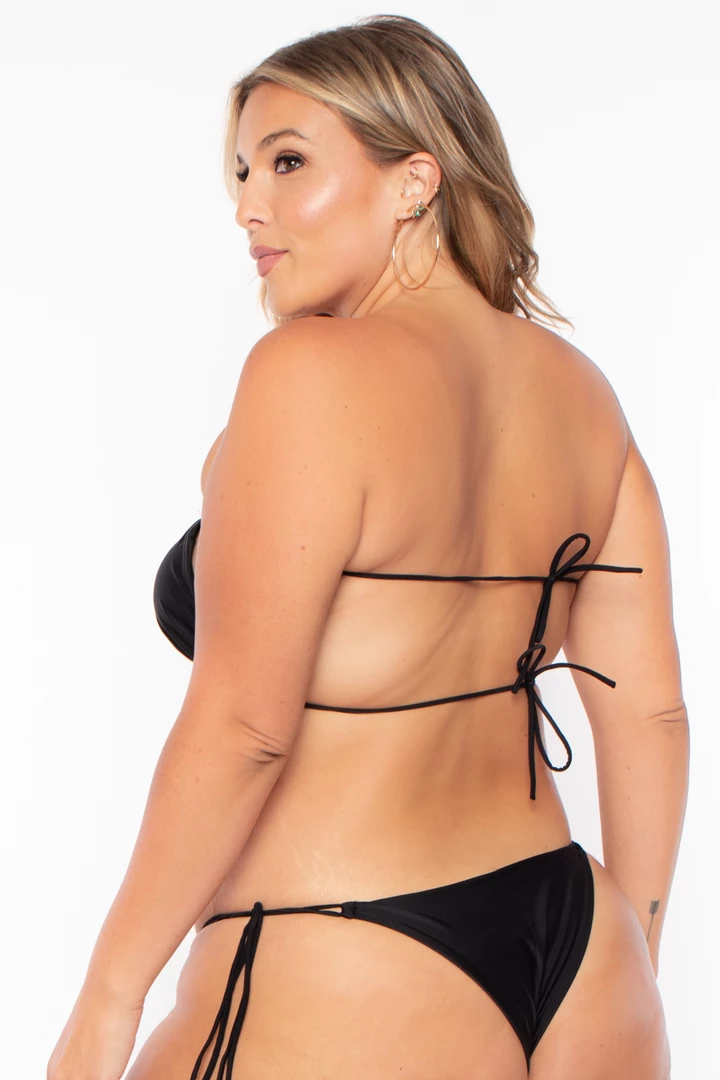 This plus-size, bikini 2 pc set swimsuit features cut out top with strings that can be tie to the back straight to as a halter the bottom has a dual string to make a cute tie and play around with the length and a cheeky cut bottom