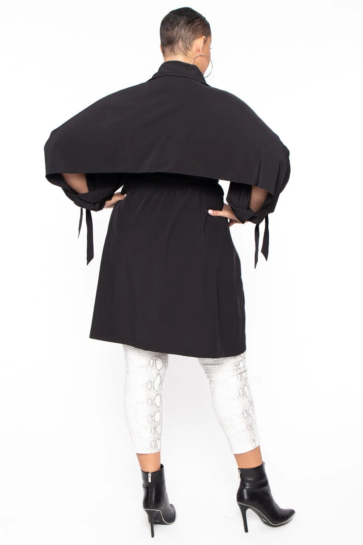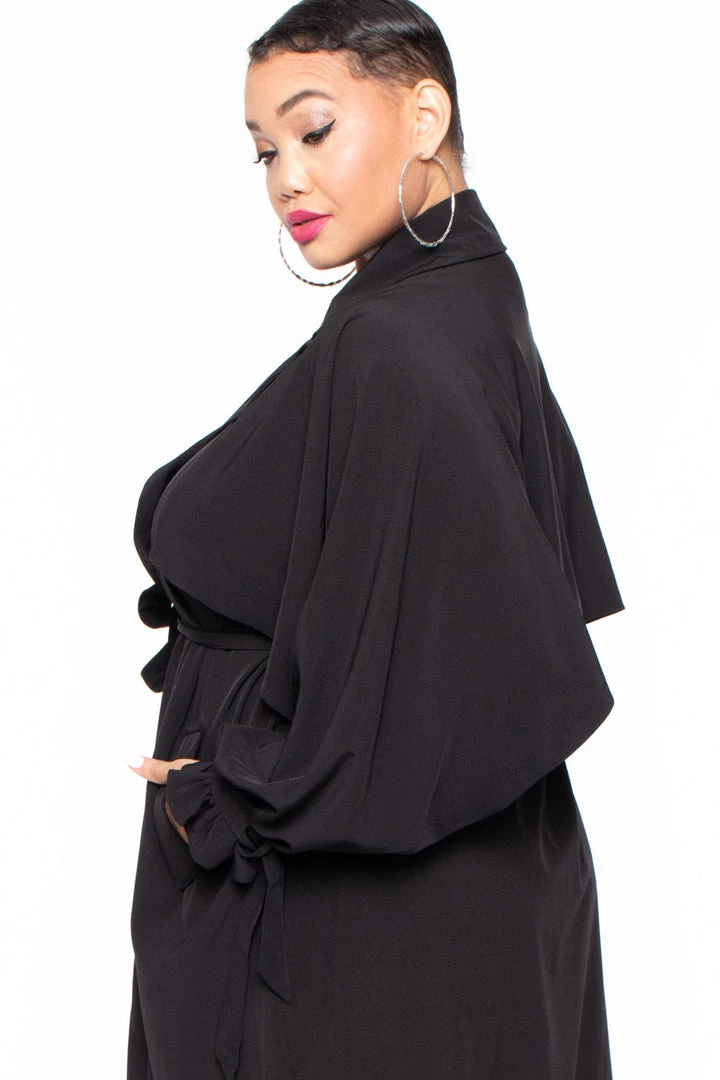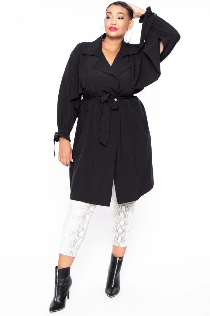 This plus size, lightweight microfiber trench coat features wide lapels, an open front with silver accent snap button closures, long sleeves with ruffle cuffs and self tie detail, a longline length, on-seam pockets, and a removable sash belt.