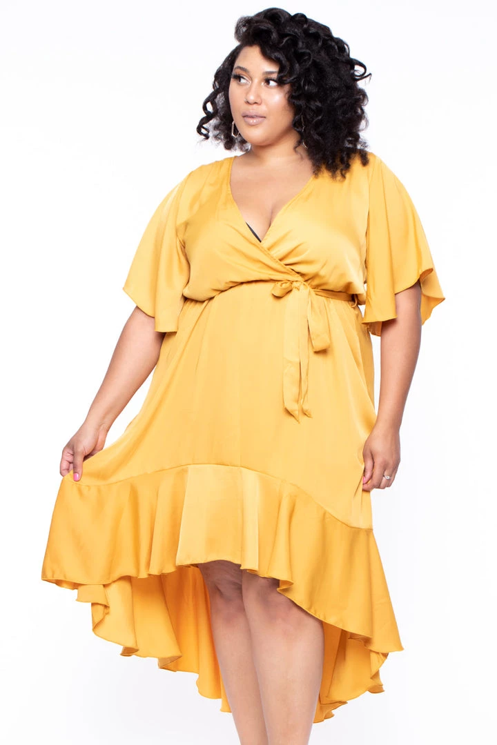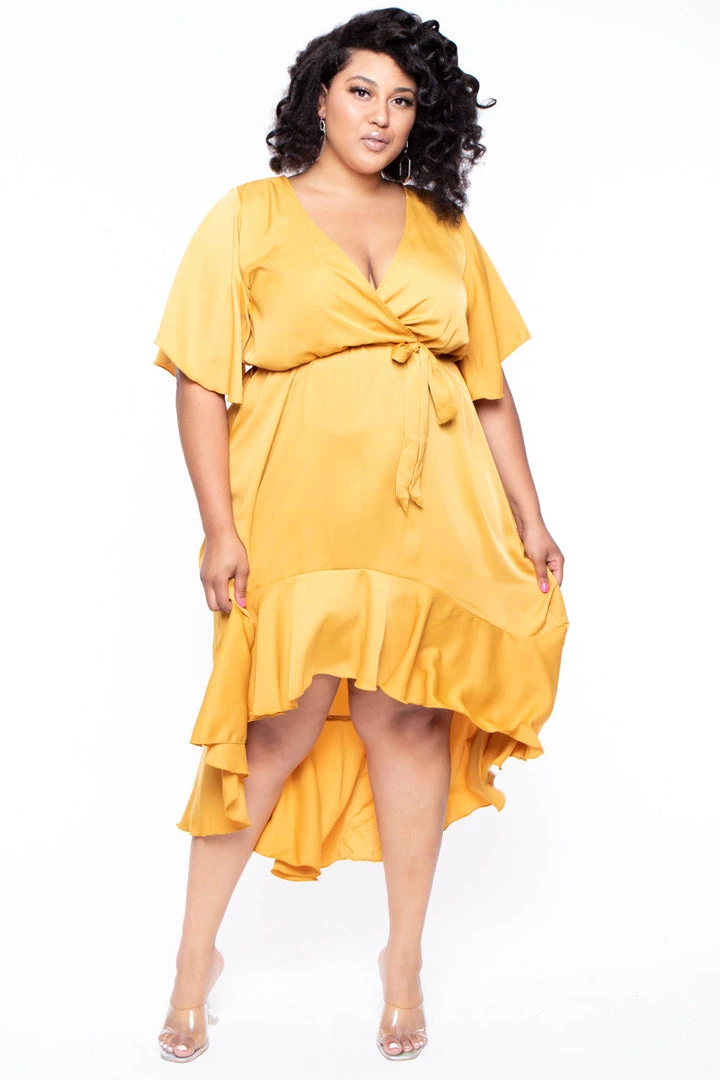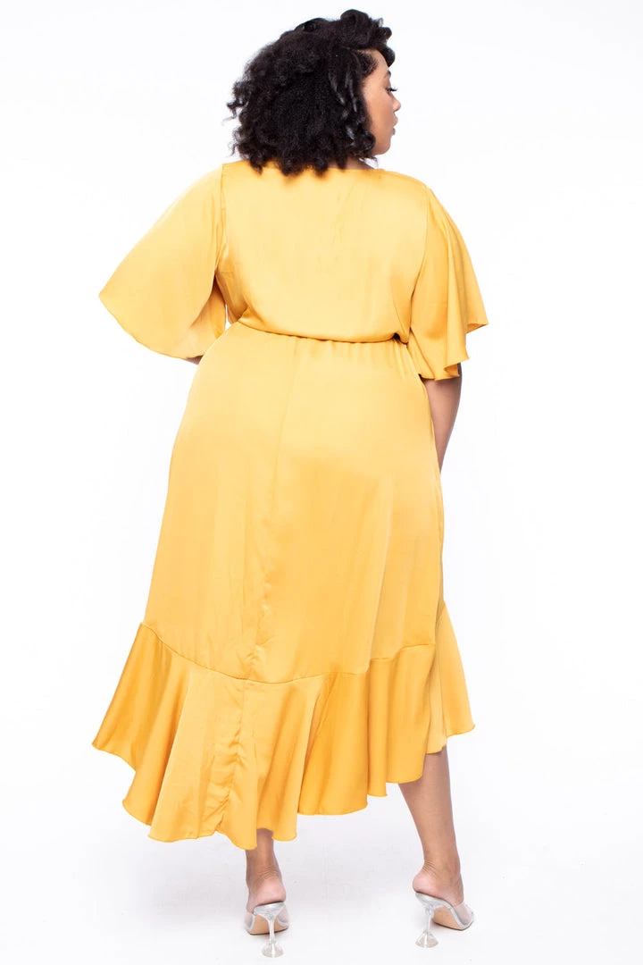 This plus size, satin dress features a plunging surplice neckline, 3/4 flowy sleeves, elastic waist with a self-tie detail, and a flowy ruffled hem