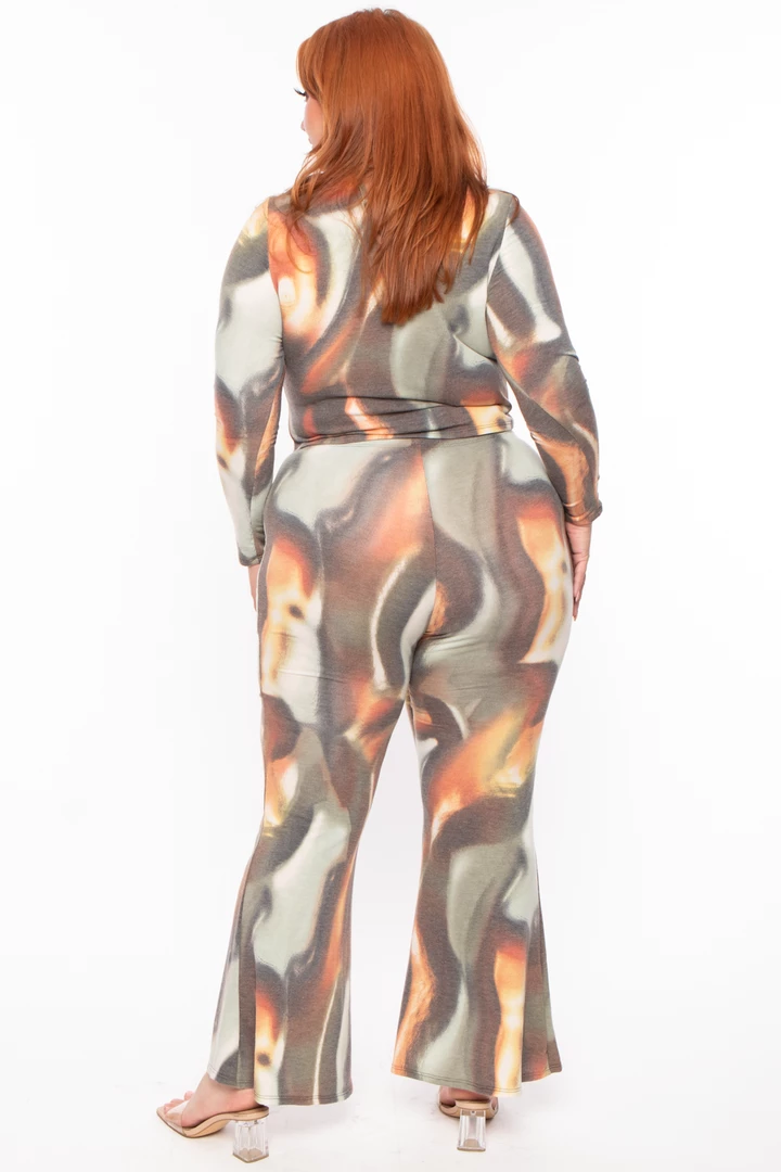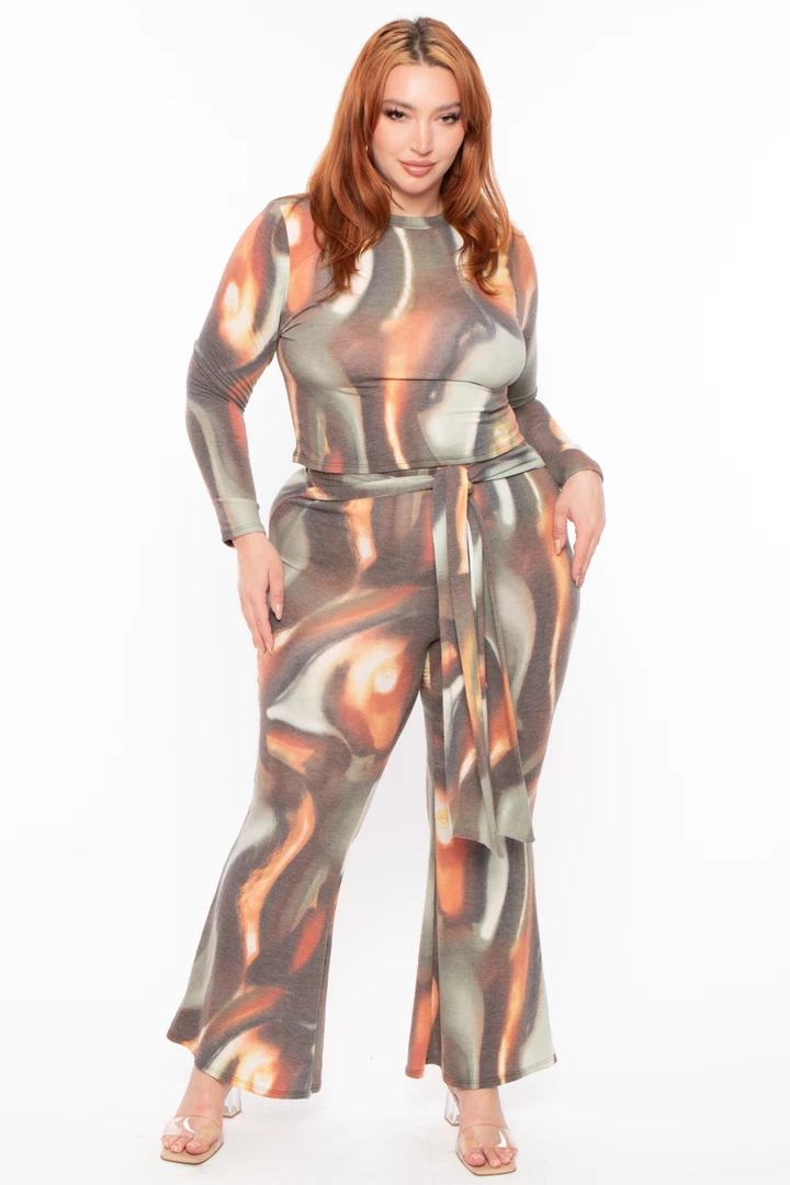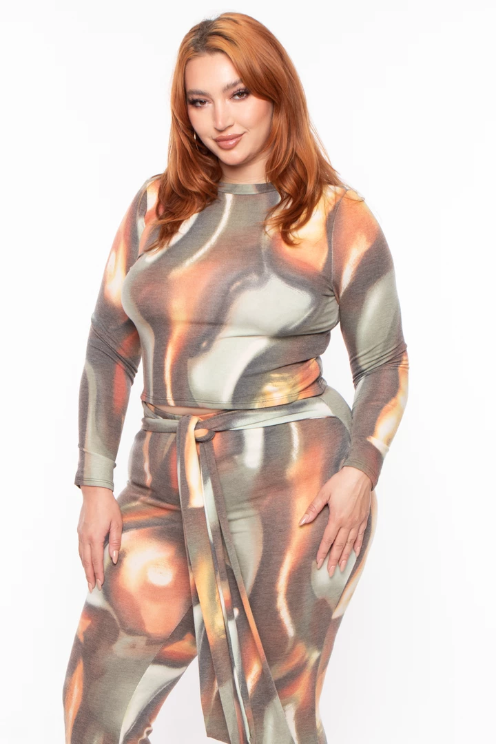 This plus size, matching set features top: crew neckline long sleeves back keyhole and 2 button closure with crop length hem, pant: elasticized waits front self-tie and wide-leg hem and all over abstract tie-dye printÂ