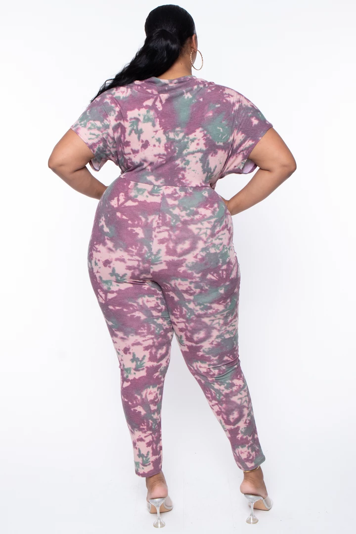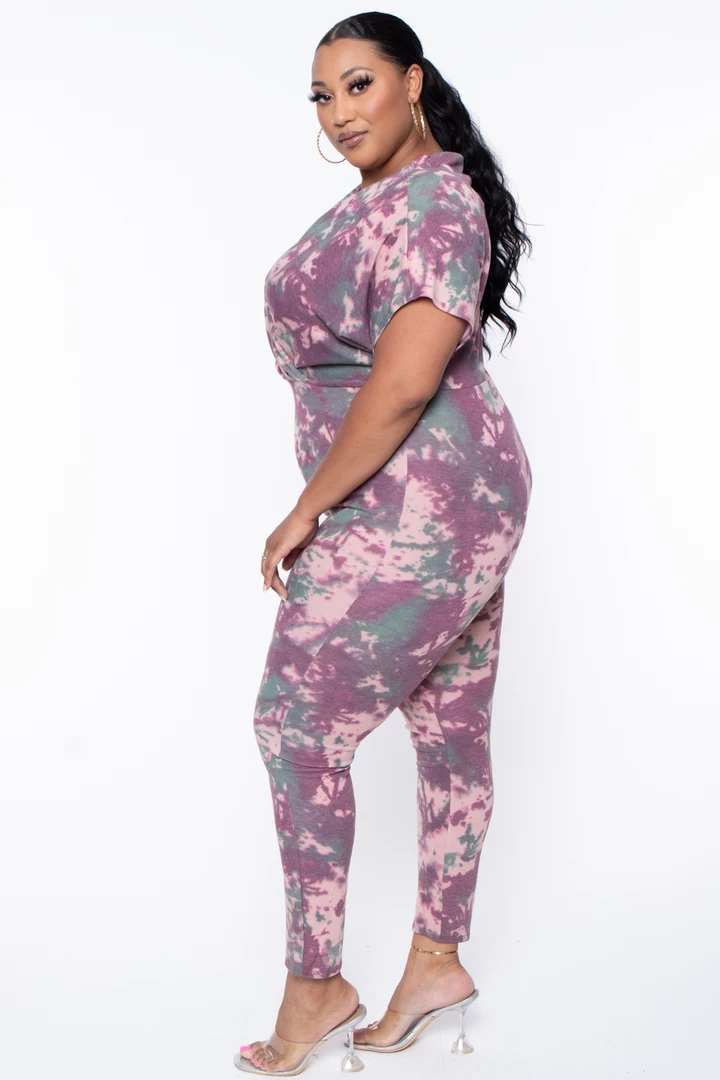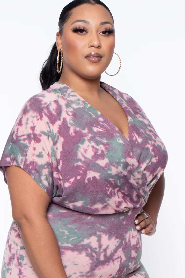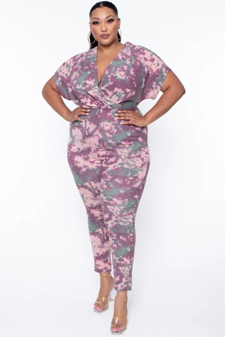 This plus size, stretch knit jumpsuit features an all-around tie-dye print, a v-neckline with a cross front style, a dolmen sleeve cut, drape and pleating, and relaxed fit