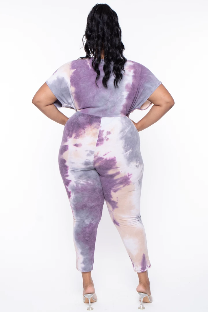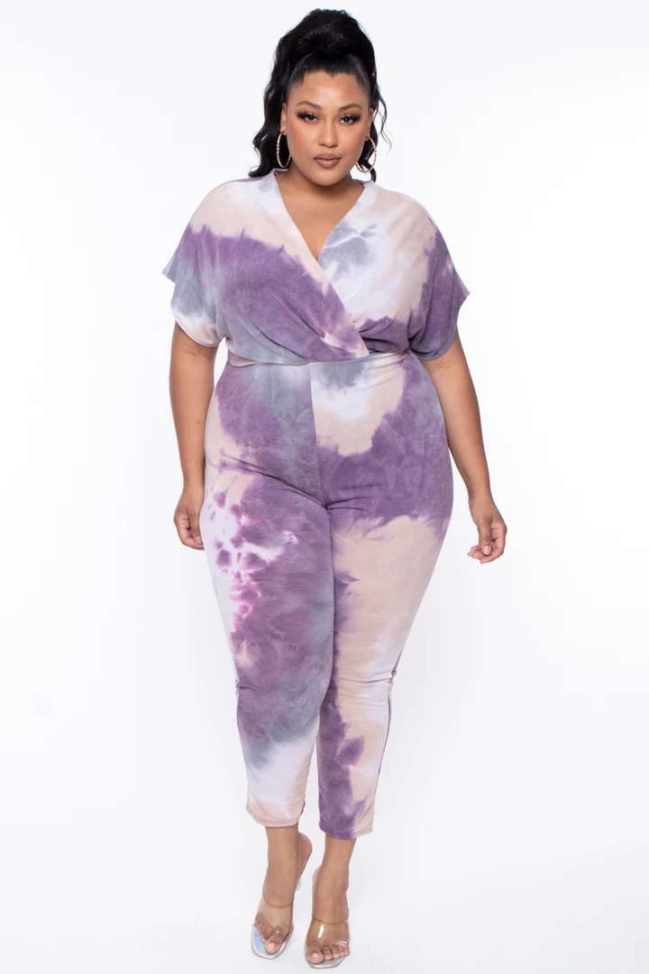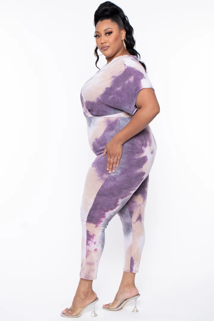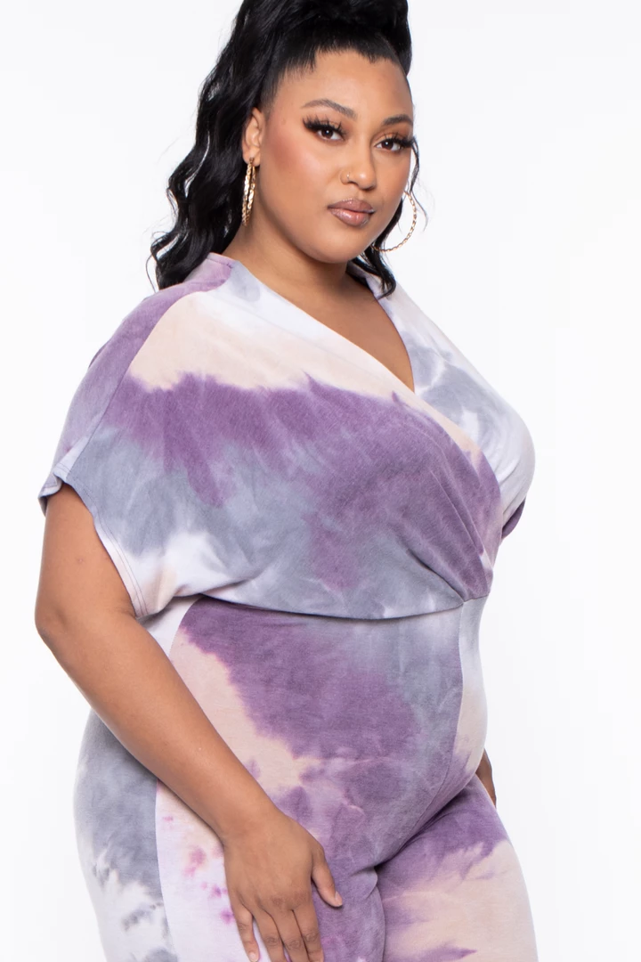 This plus size, stretch knit jumpsuit features an all-around tie-dye print, a v-neckline with a cross front style, a dolmen sleeve cut, drape and pleating, and relaxed fit