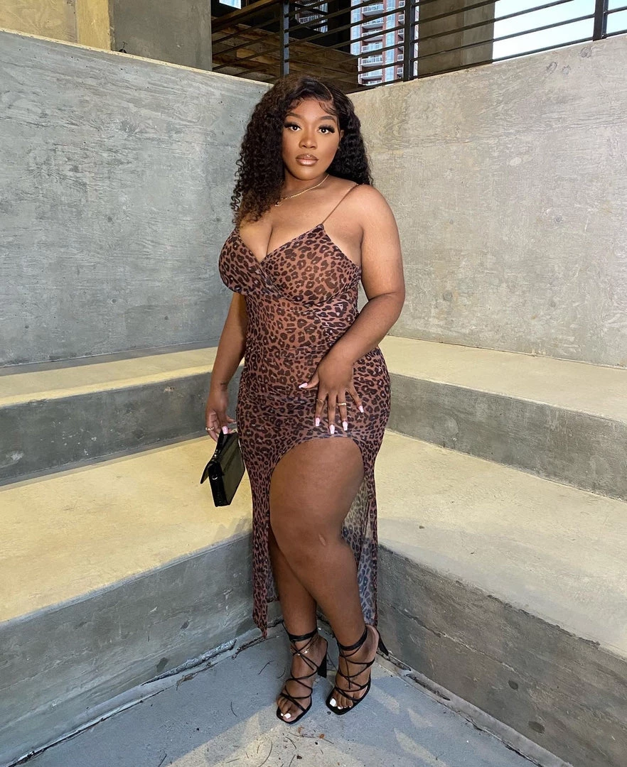This plus size, stretch mesh dress features pleated cross-front, adjustable cami straps back zipper closure, ruched side front detail and silt partial lining, and maxi length bodycon silhouette. Beautiful leopard mesh print.