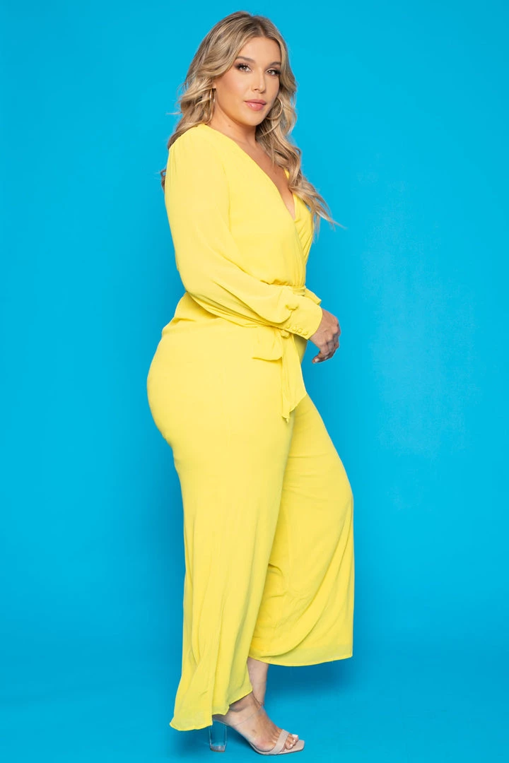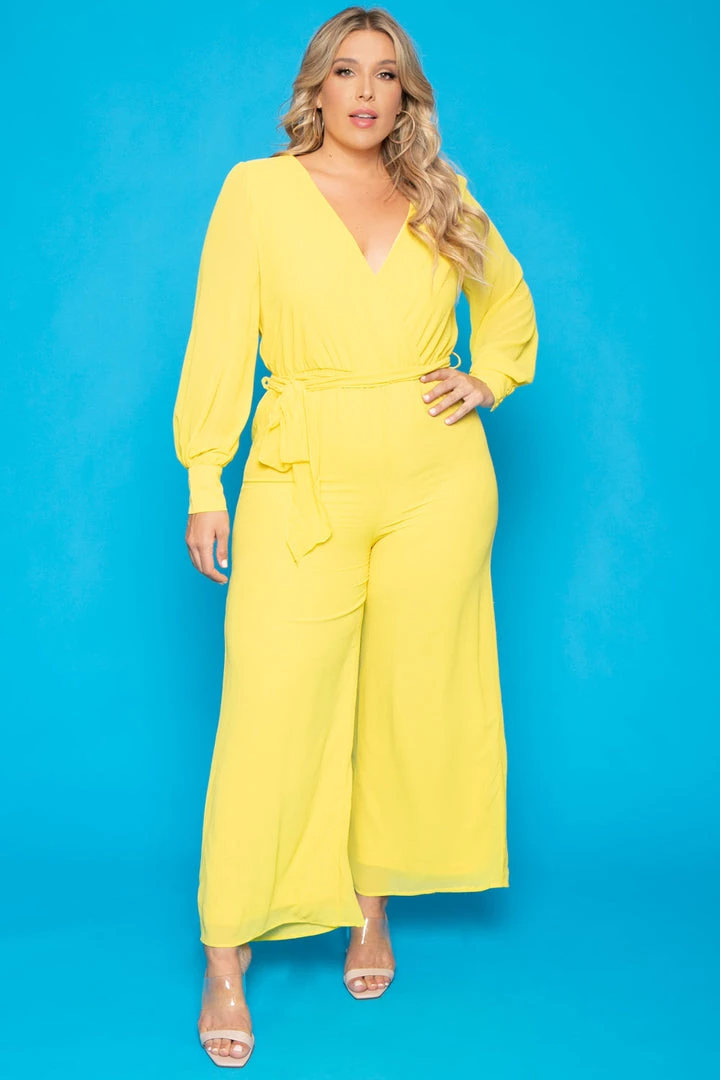 This plus size, sheer crepe jumpsuit features a plunging surplice neckline, long sleeves with button cuffs, elastic waist with self-tie detail, fully lined, and a wide leg.