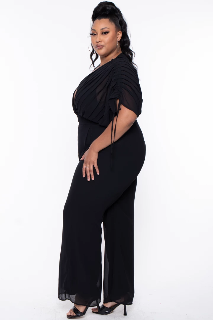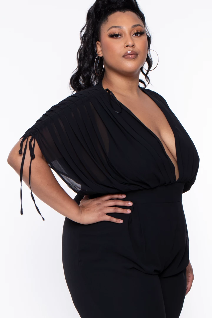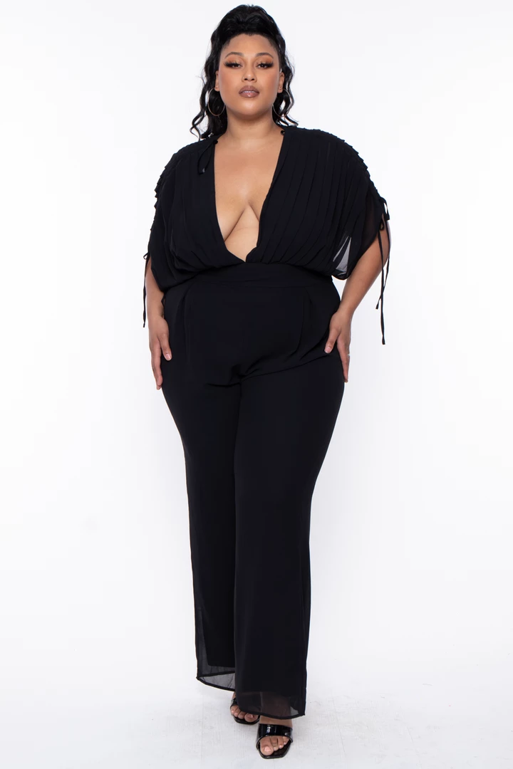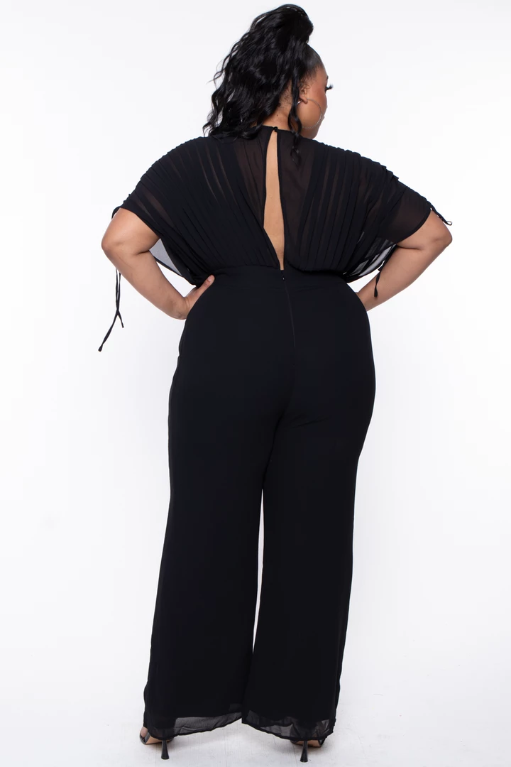 This plus size, chiffon jumpsuit, features a pleated top with plunging neckline,a back open keyhole, fully lined,back zipper and a wide leg