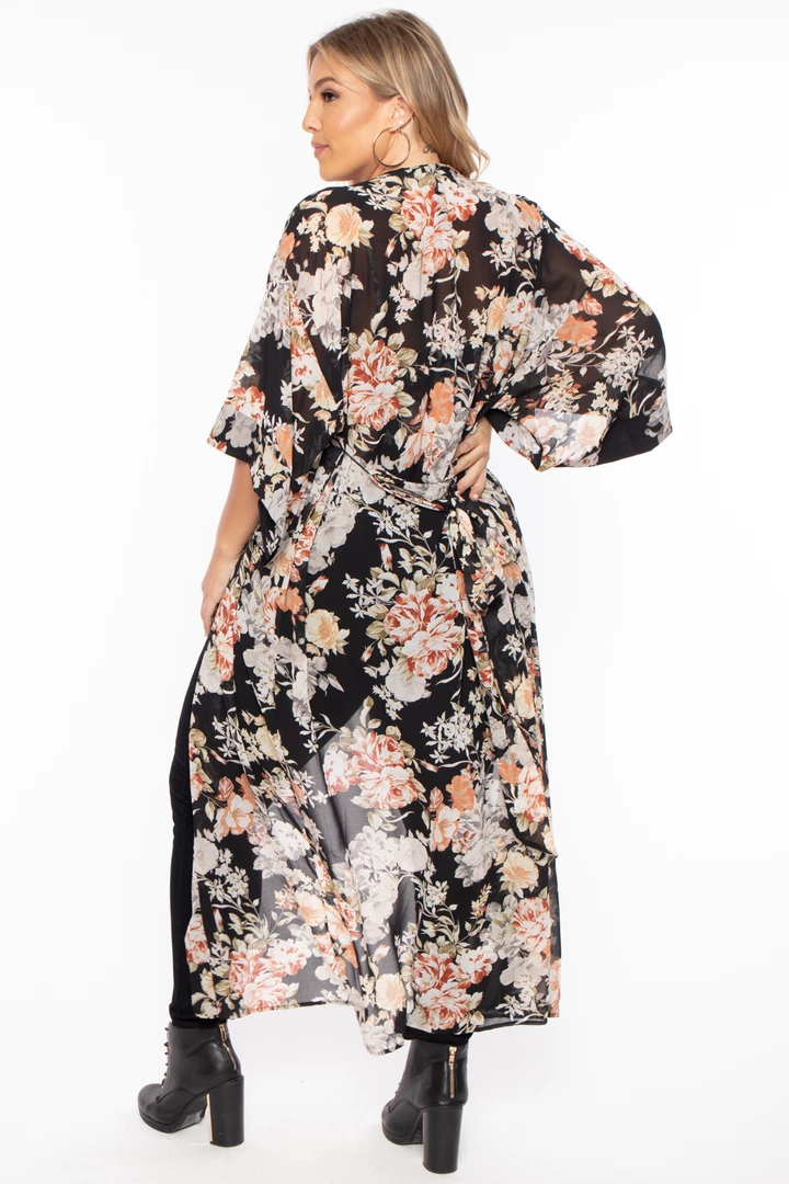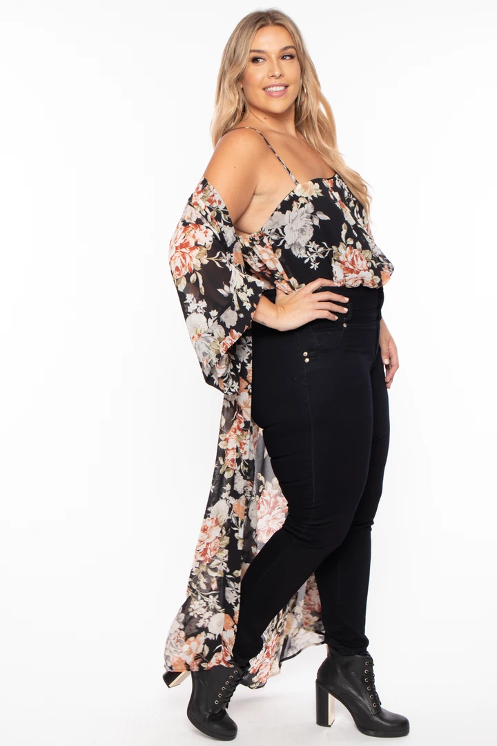 This plus size stretch bodysuit and kimono set features a bodysuit with a sleeveless square neckline, adjustable cami straps, elasticized waistline, and snap-button closures. Paired with a matching kimono that features an open front, 3/4 dolman sleeves, self tie belt, and maxi length sillouhete.