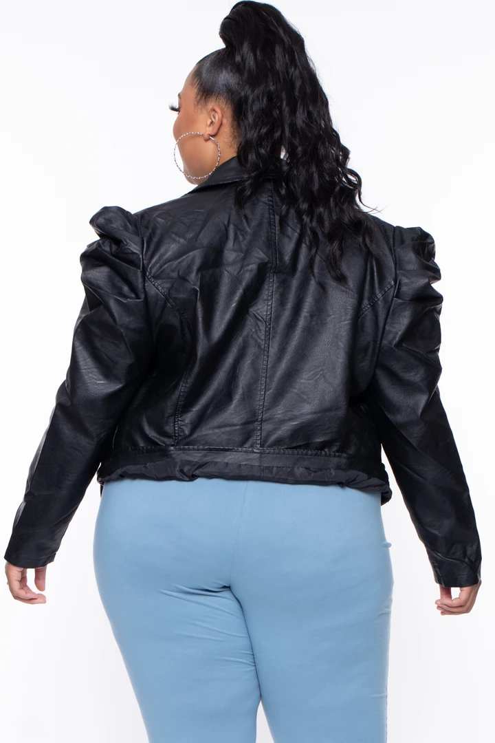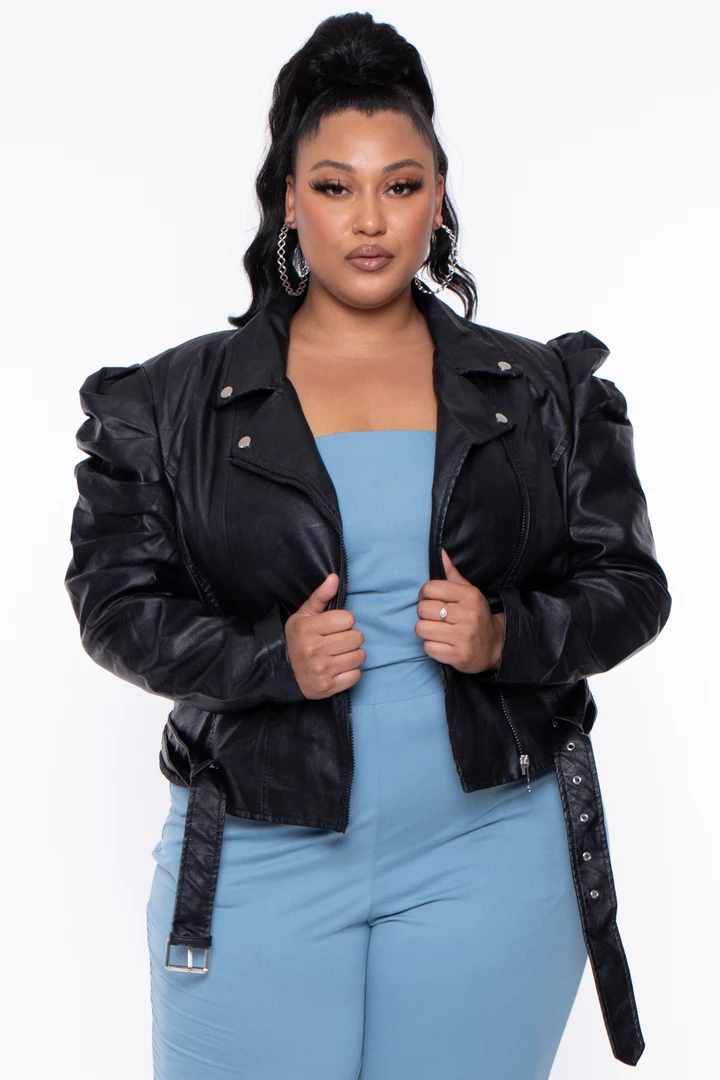 This plus size, faux leather moto jacket features notched lapels, long sleeves with gather tucked detail at cap, high-polish accents, front zipper pockets, front zip closure, fully lined, and an attached buckle belt at the hem.