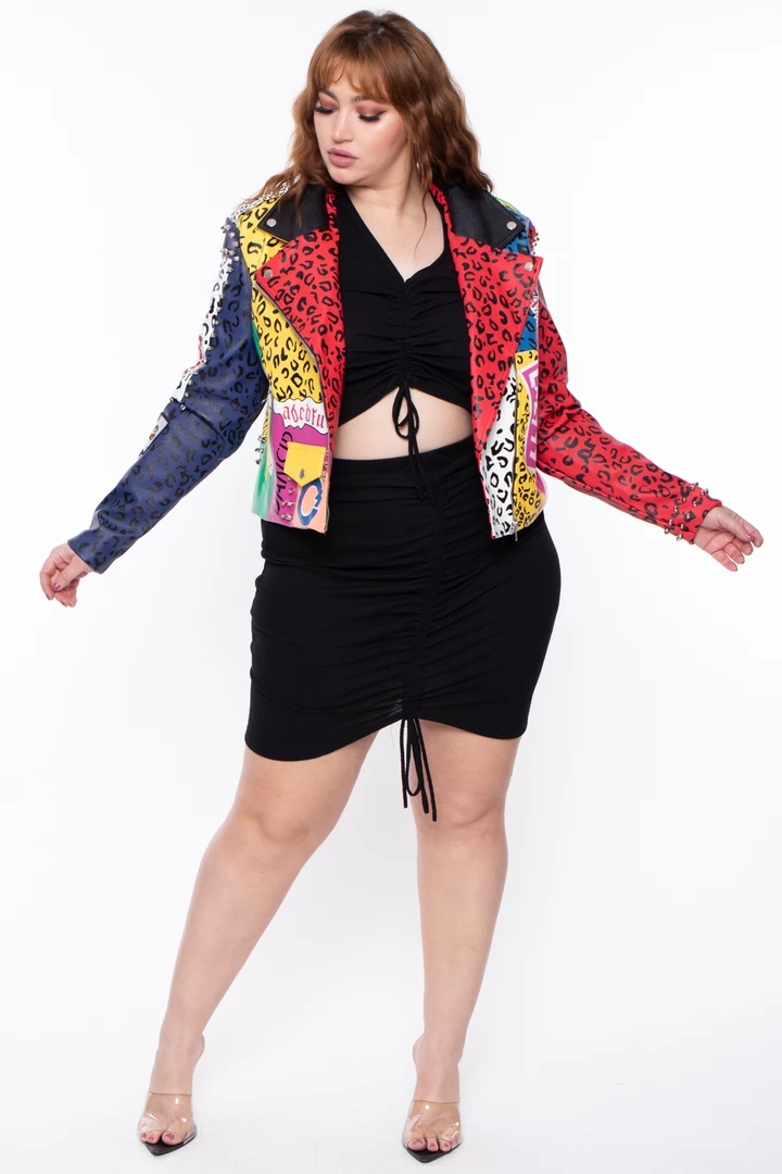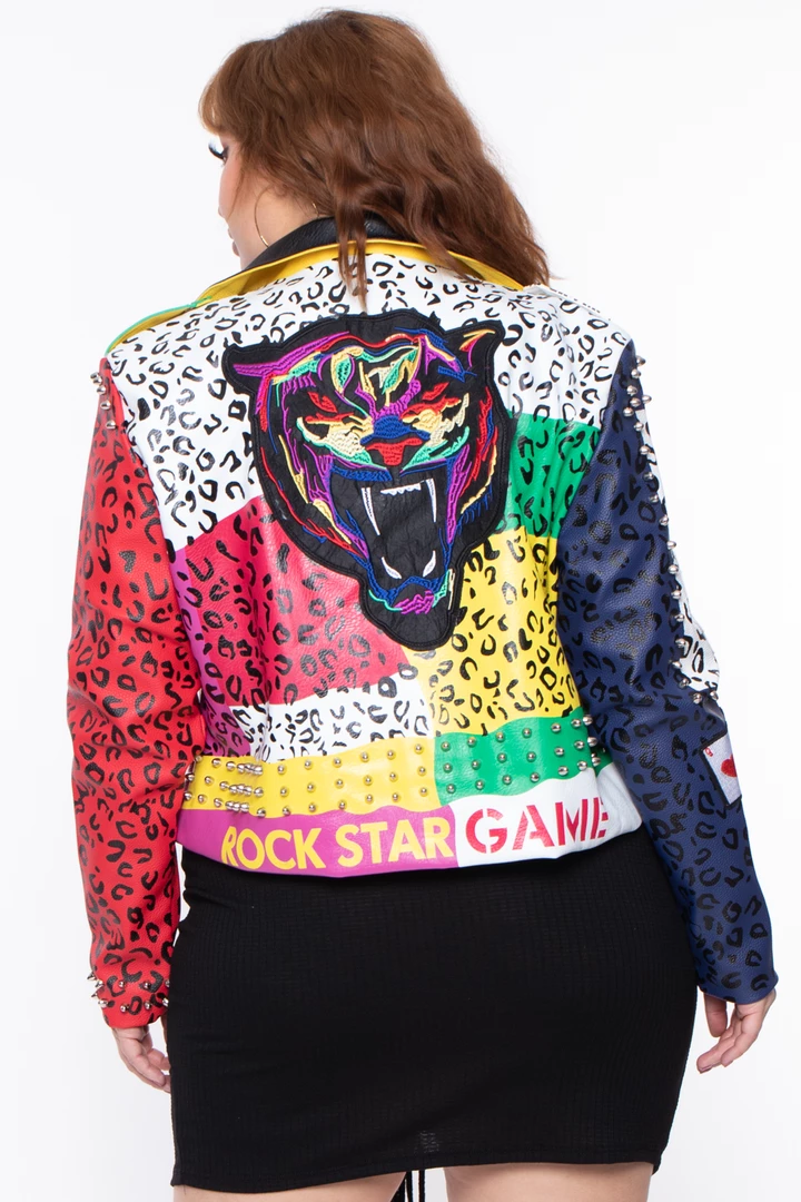 This plus size, faux leather jackets features an asymmetrical front zipper closure basic collar with button detail, shoulder epaulettes long sleeves, with front side fake welt button pocket, and two zippers front pockets and is fully lined. this amazing moto jacket has a leopard print to the upper side also patches and studs to complement a badass jacket