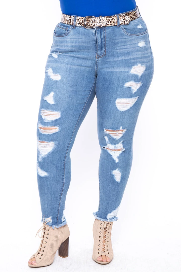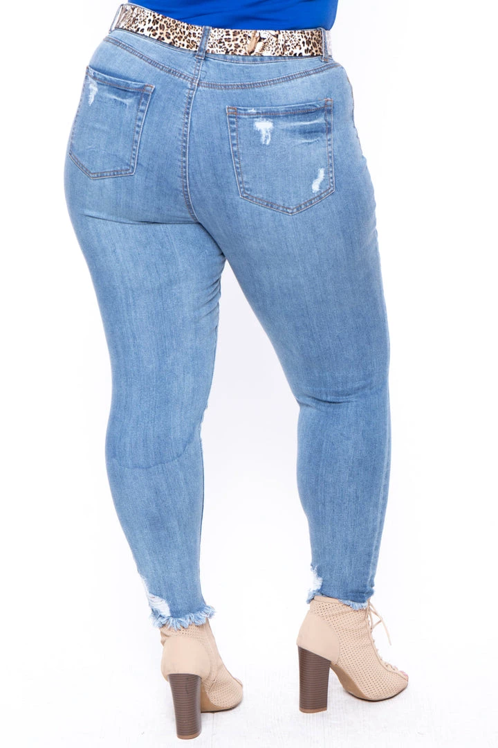 This plus size, dollhouse jean features a zipper fly with button closure, 5-pocket construction, a distressed design, and a removable cheetah belt, and a skinny leg with a raw edge fray hem.
