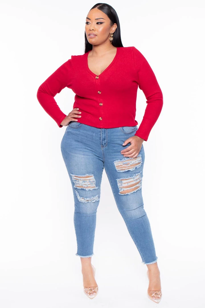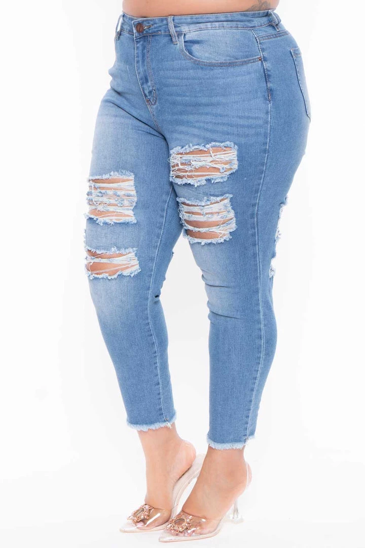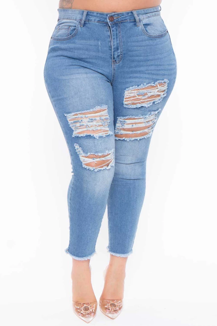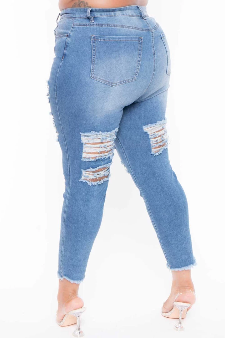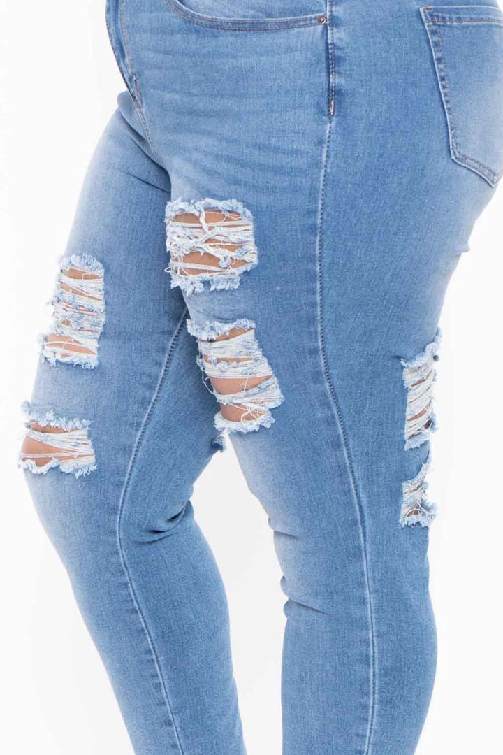 This plus size, high rise skinny jeans features distressed details on the the front and back of the jeans. Christina sits at the natural waist, fitted through hips, thighs and leg