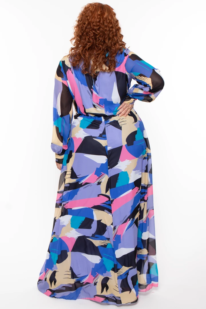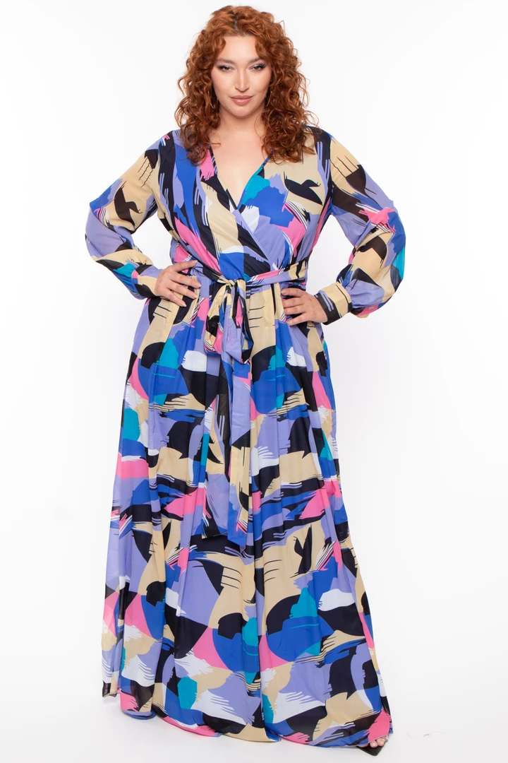 This plus size, woven maxi dress features a beautiful all over abstract print, fully lined, surplice front neckline, long sleeves with 3 gold buttons, elastic waist with a self tie belt. Flowing maxi skirt is perfect for making an entrance & a twirl.
