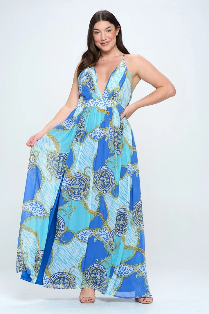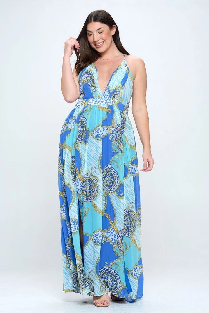 This plus size, maxi dress features a bold graphic print, plunging v neckline, front slit details and criss cross straps in the back
