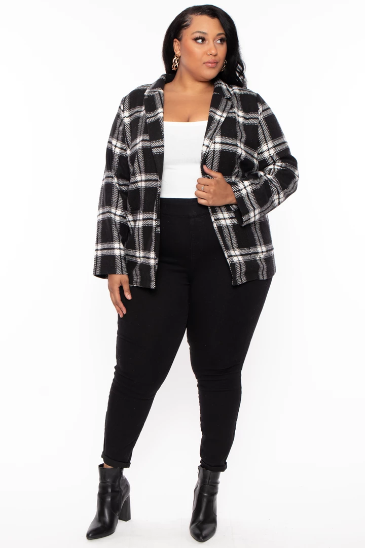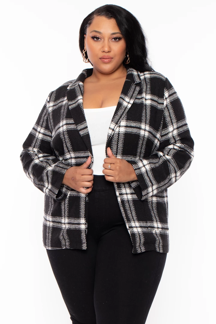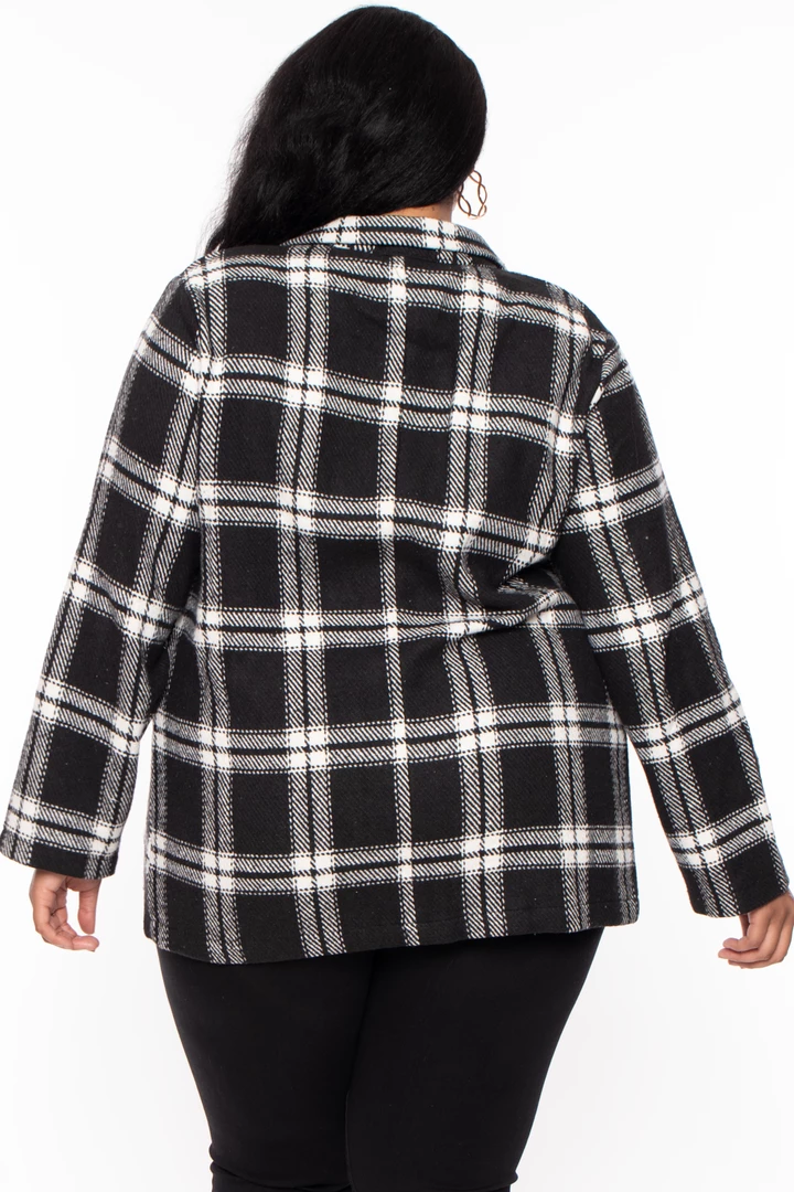 Cozy black winter coat perfect for layering with a plaid design and pockets.