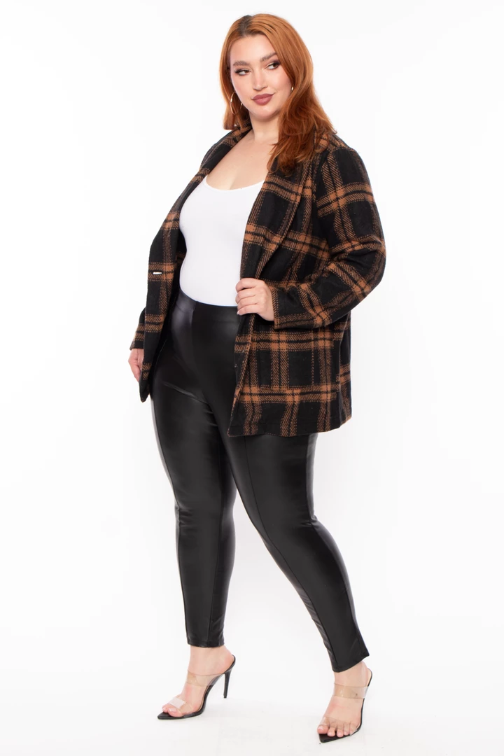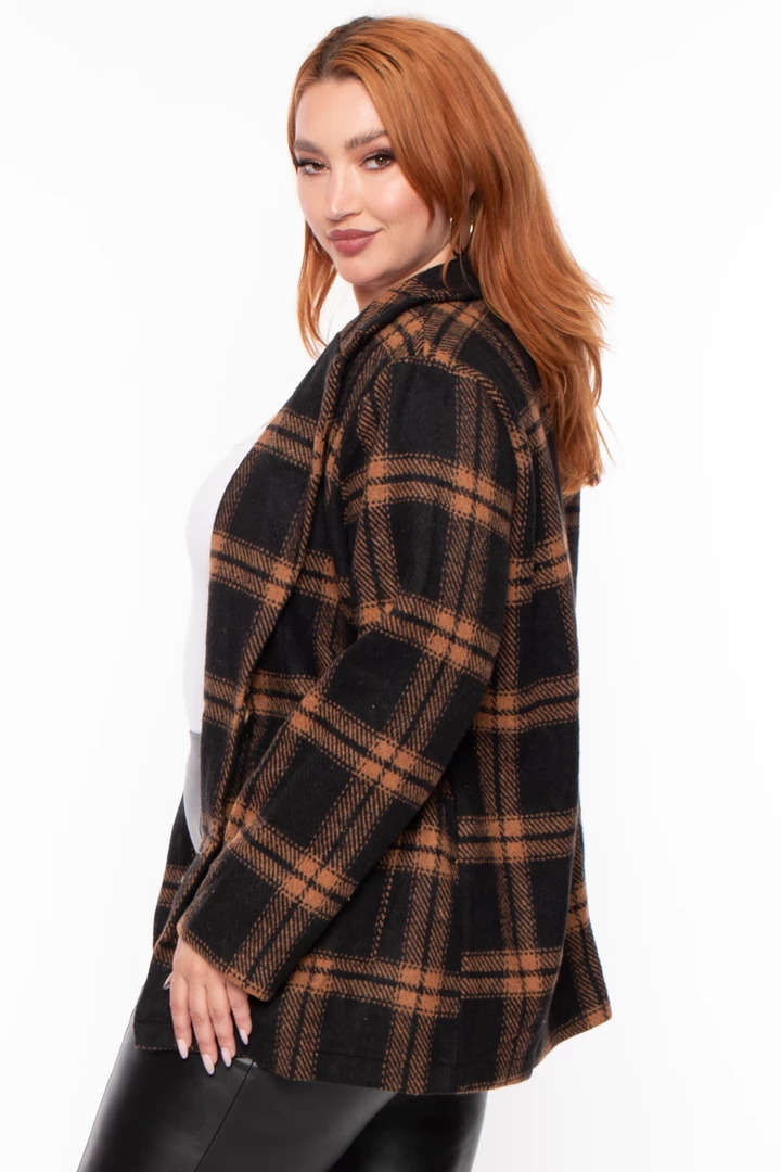 Cozy mocha winter coat perfect for layering with a plaid design and pockets.