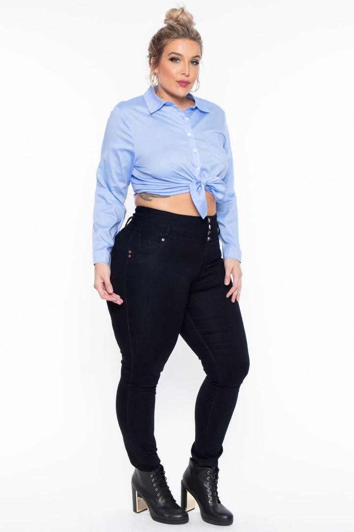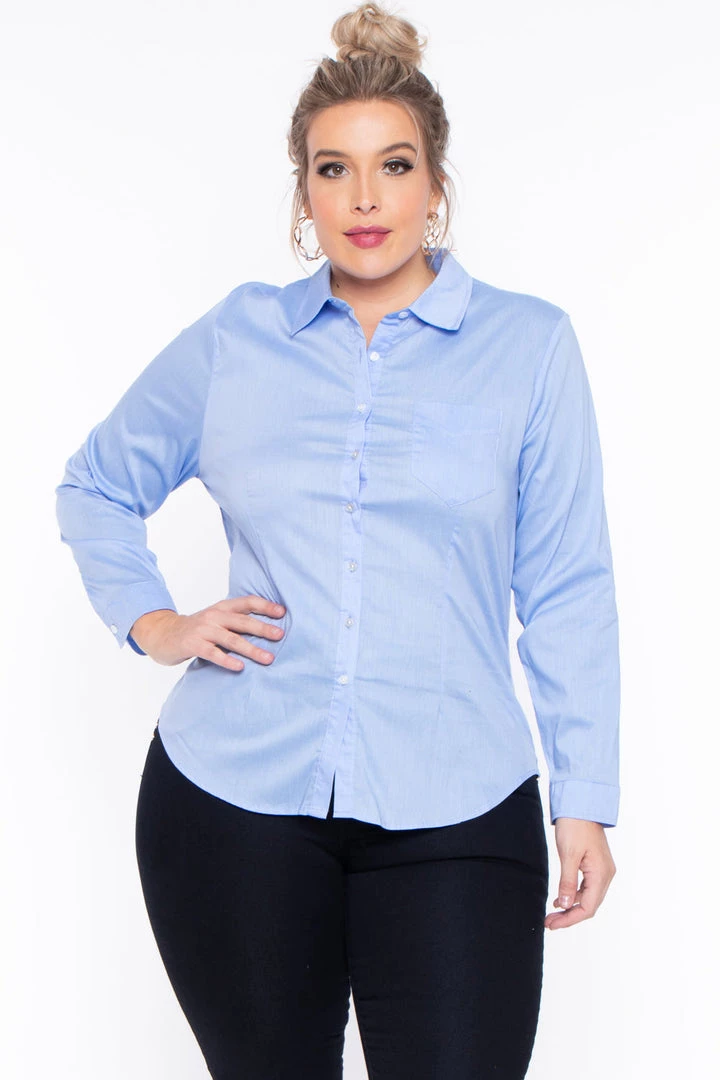 This plus size, tailored top is perfect for a sophisticated look. The Boss Babe features a classic tailored look, 8 button up closure, long sleeves, rounded hemline, and front pocket