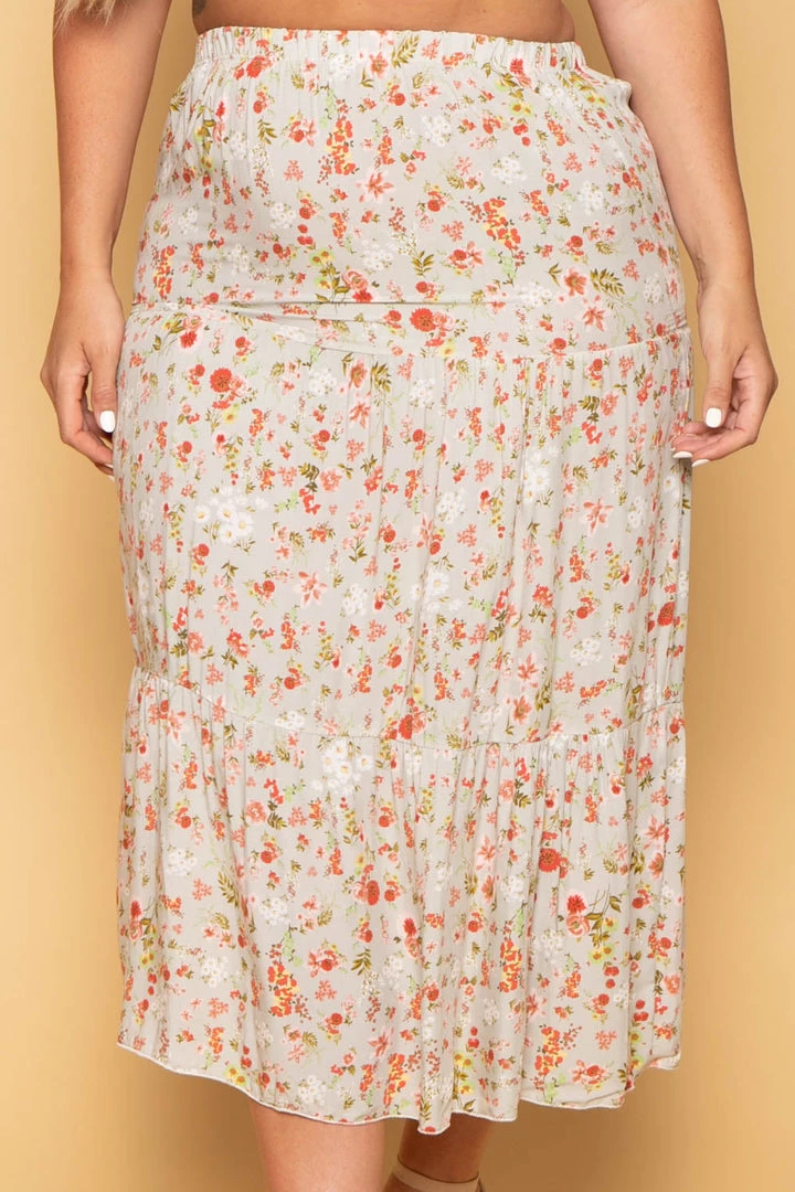 This plus size stretch skirt features an elasticized waist, tiered design, flowy, and a midi length.