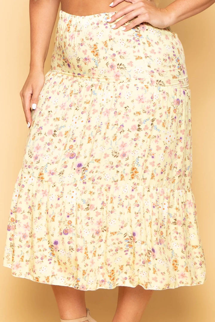 This plus size stretch skirt features an elasticized waist, tiered design, flowy, and a midi length.