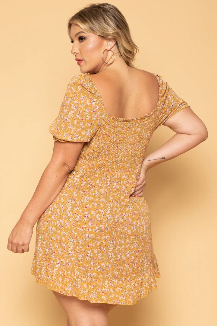 This plus size, dress features an all-over printed multi-color floral design, short sleeves with ruffled hem, smocked bodice with tie accent and ruffled bottom hem and the material is lightweight
