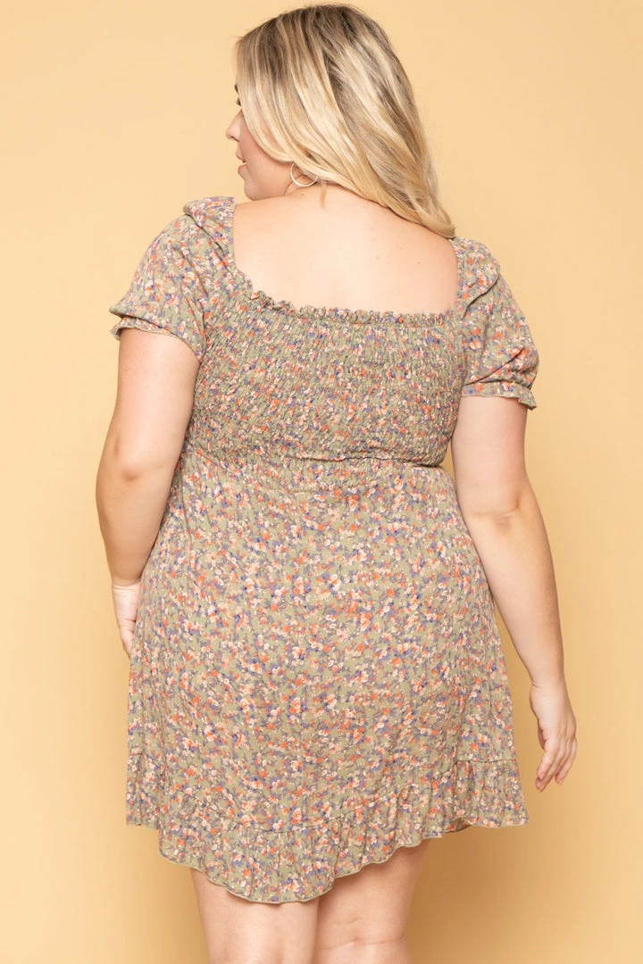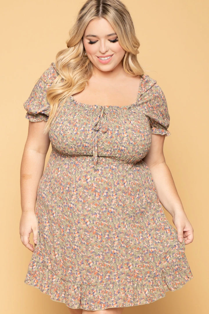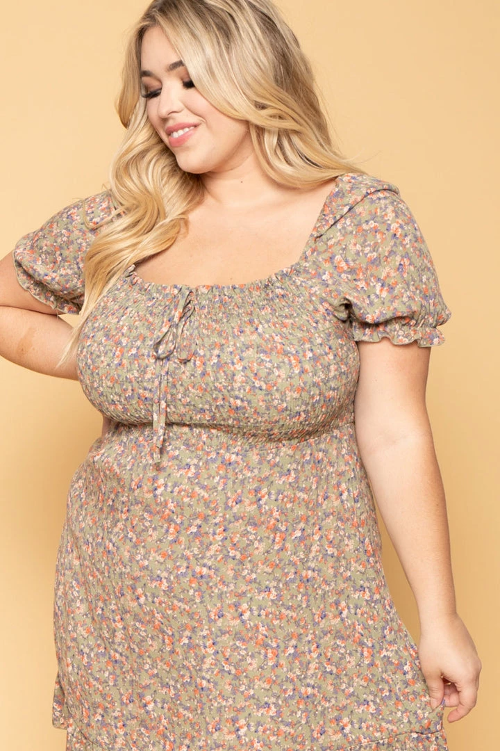 This plus size, dress features an all-over printed multi-color floral design, short sleeves with ruffled hem, smocked bodice with tie accent and ruffled bottom hem and the material is lightweight