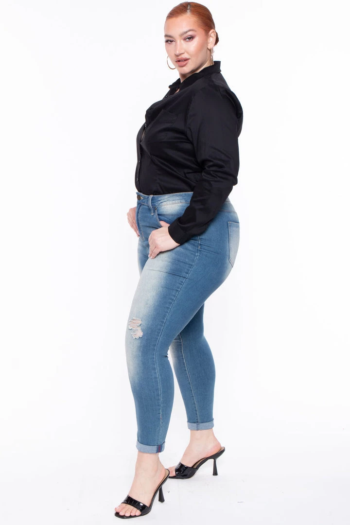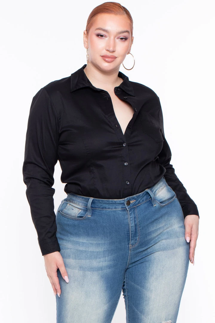 This plus size, tailored top is perfect for a sophisticated look. The Boss Babe features a classic tailored look, 8 button up closure, long sleeves, rounded hemline, and front pocket