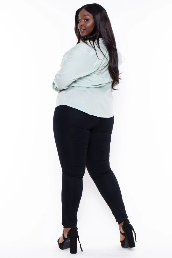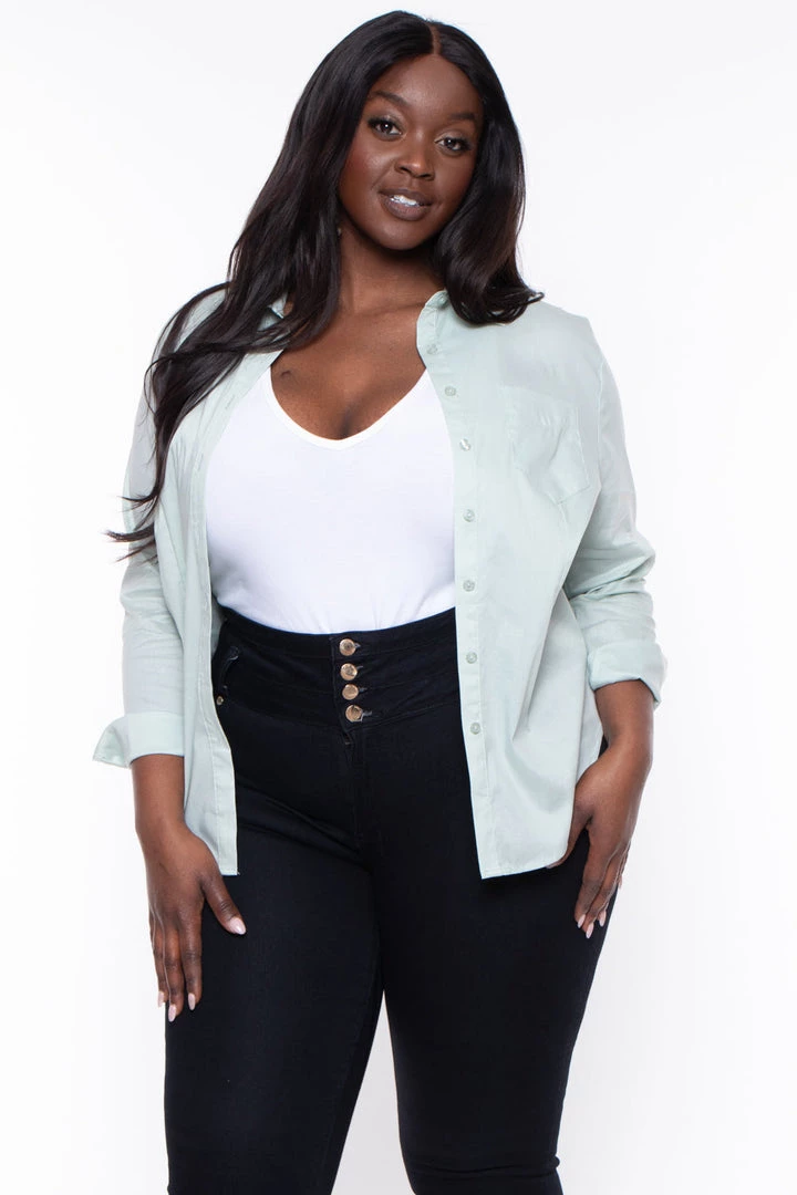 This plus size,  tailored top is perfect for a sophisticated look. The Boss Babe features a classic tailored look, 8 button up closure, long sleeves, rounded hemline, and front pocket