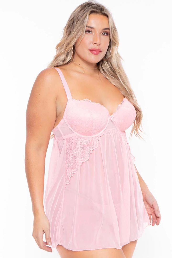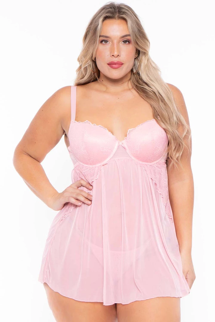 This plus size, 2 piece lingerie set is so adorable! Francie features a babydoll top with lace detailing and sheer fabric, adjustable straps and matching thong