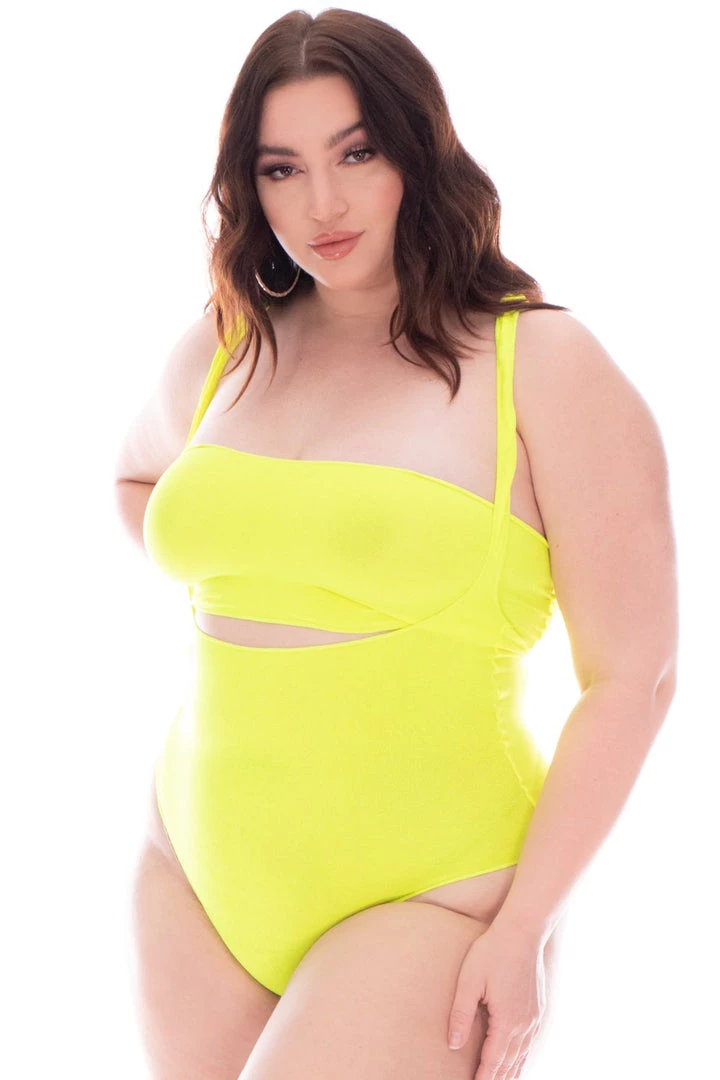 This plus size, stretch lingerie features a suspender bodysuit with a removable bandeau and a thong cut