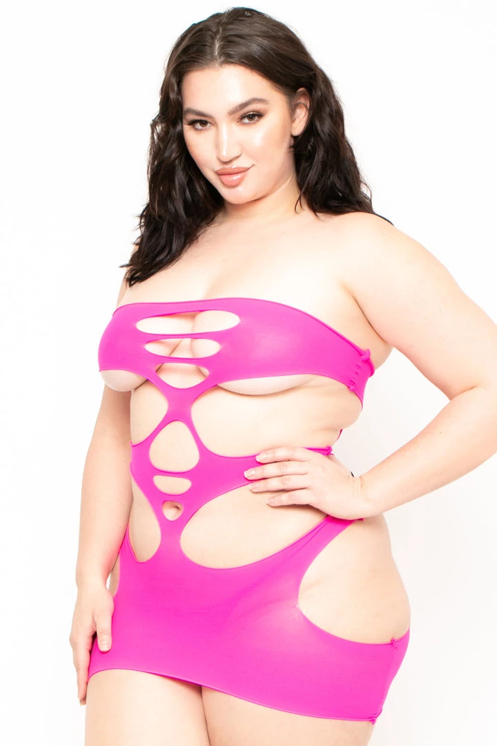 This plus size, stretch lingerie features a seamless shredded mini dress with a cut out detail