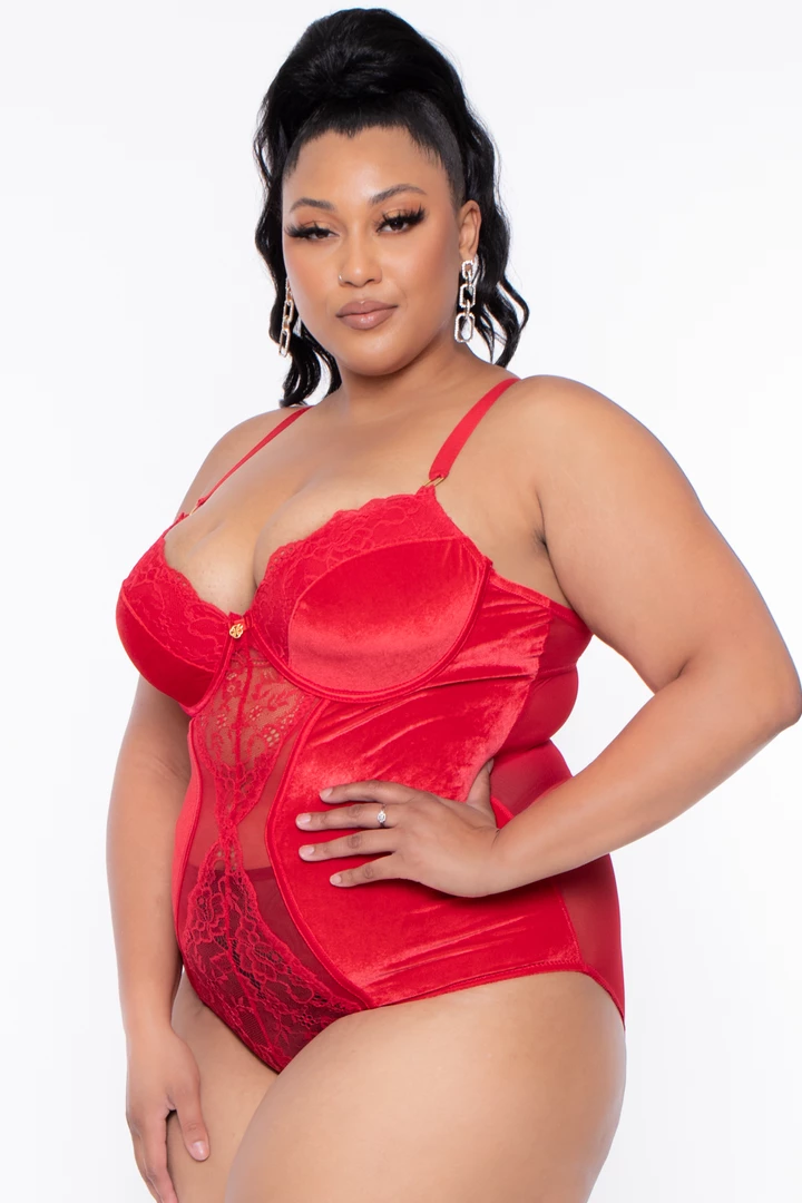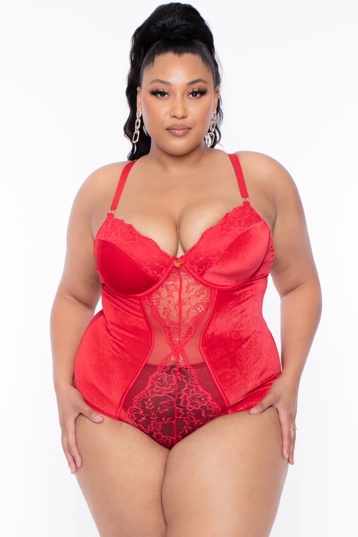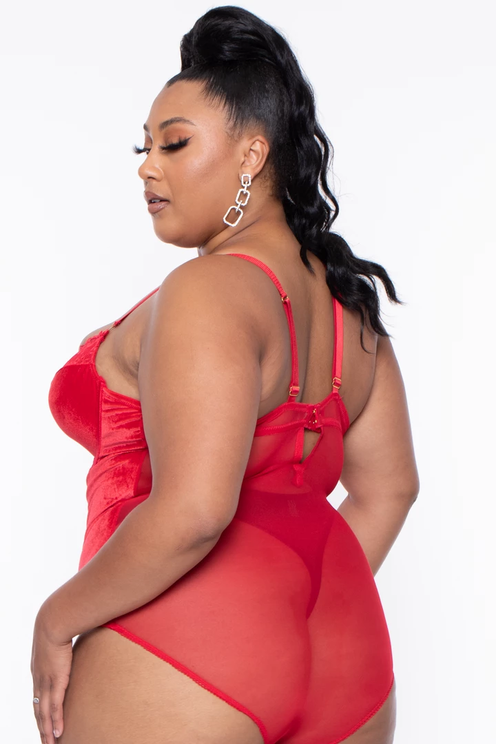 This plus size, stretch lingerie features a padded bra cup, velvet, and floral lace, the back is ultra-stretch mesh, dual adjustable cami straps that cross hook at the back, and a snap bottom at the hem.